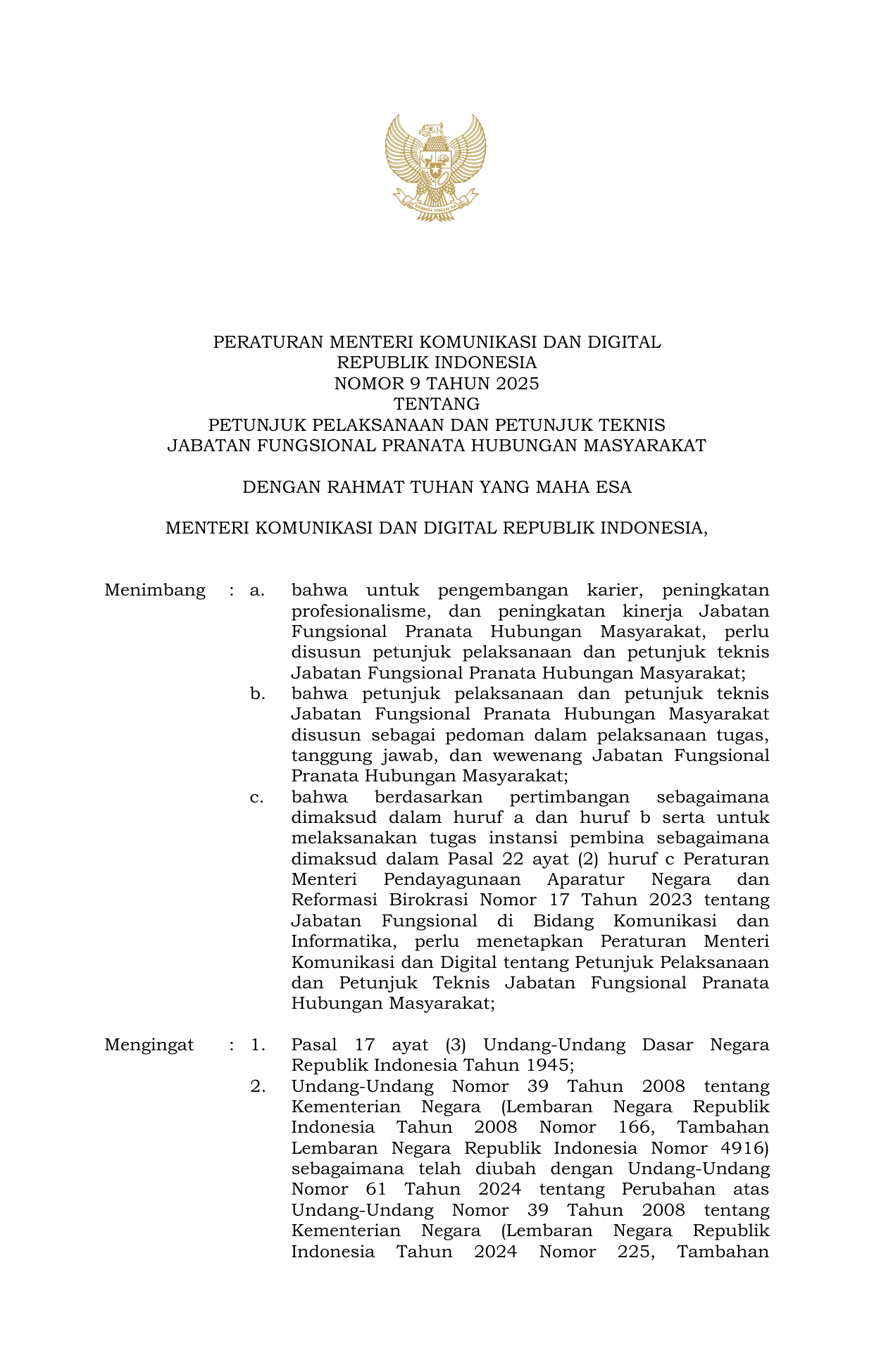 PERMEN Nomor 9 Tahun 2025 | Peraturan Menteri Nomor 9 Tahun 2025 tentang PETUNJUK PELAKSANAAN DAN PETUNJUK TEKNIS JABATAN FUNGSIONAL PRANATA HUBUNGAN MASYARAKAT
