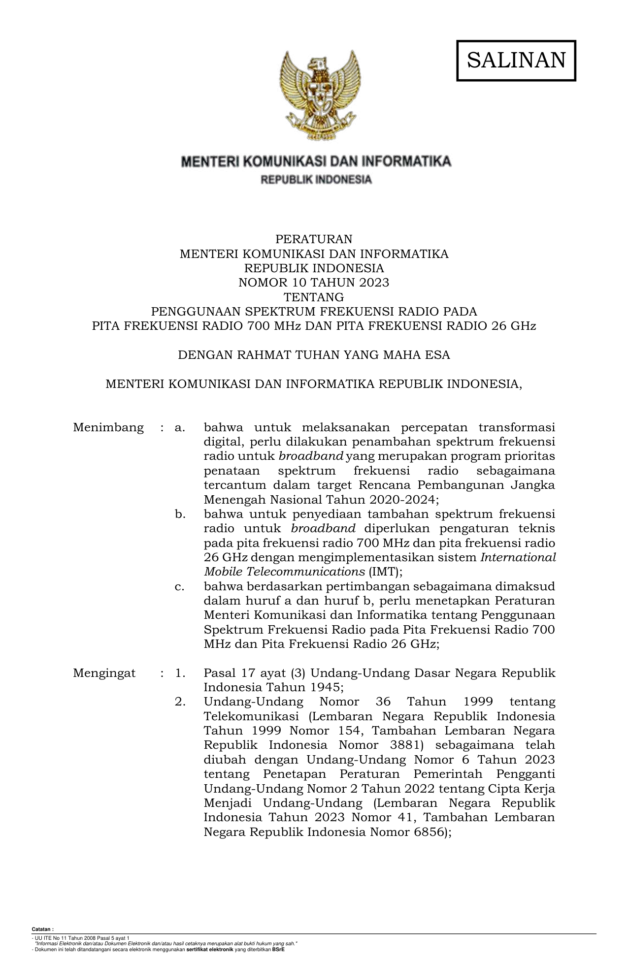 PERMEN Nomor 10 Tahun 2023 | Peraturan Menteri Nomor 10 Tahun 2023 tentang PENGGUNAAN SPEKTRUM FREKUENSI RADIO PADA PITA FREKUENSI RADIO 700 MHz DAN PITA FREKUENSI RADIO 26 GHz