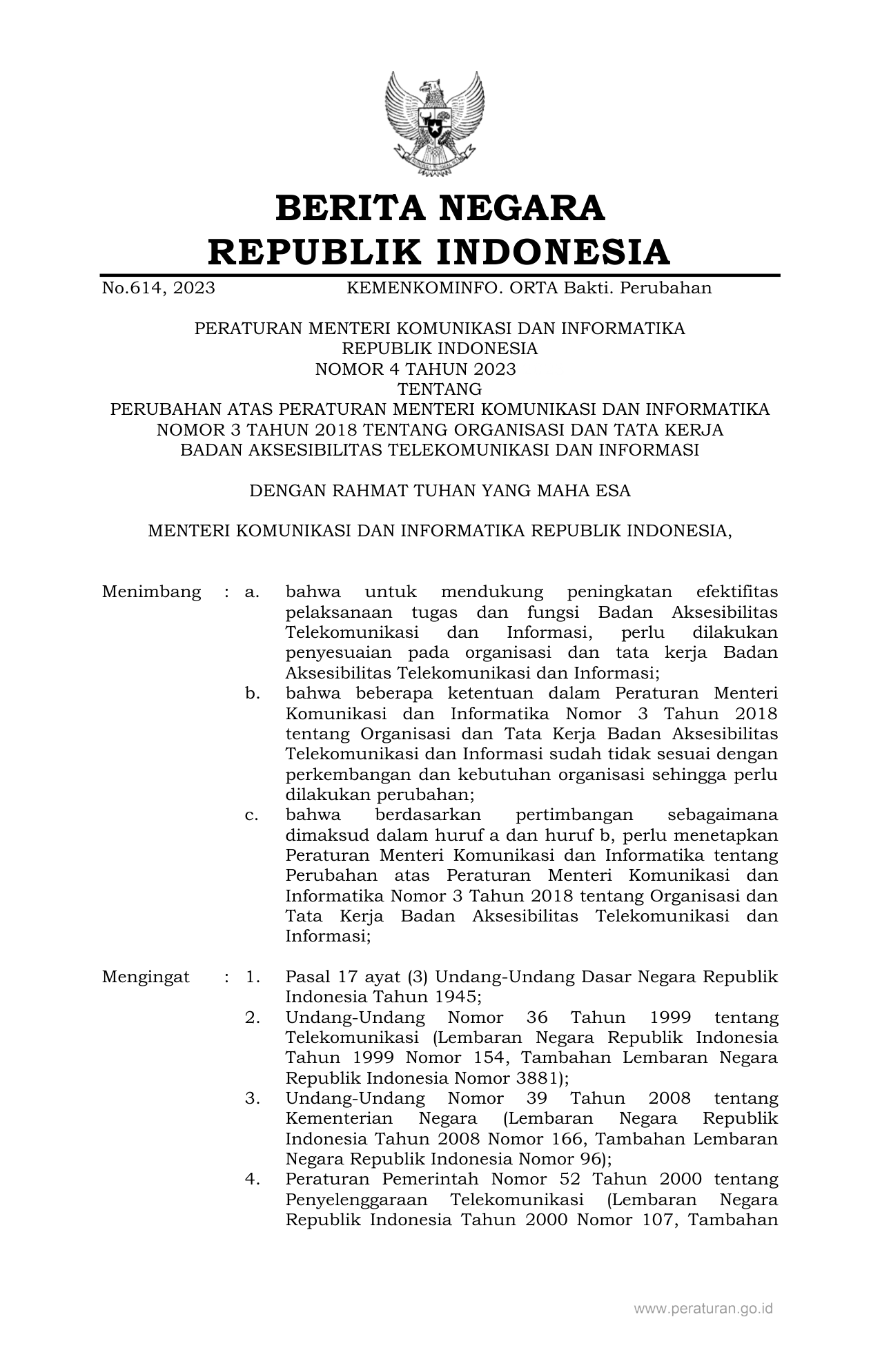 PERMEN Nomor 4 Tahun 2023 | Peraturan Menteri Nomor 4 Tahun 2023 tentang PERUBAHAN ATAS PERATURAN MENTERI KOMUNIKASI DAN INFORMATIKA NOMOR 3 TAHUN 2018 TENTANG ORGANISASI DAN TATA KERJA BADAN AKSESIBILITAS TELEKOMUNIKASI DAN INFORMASI