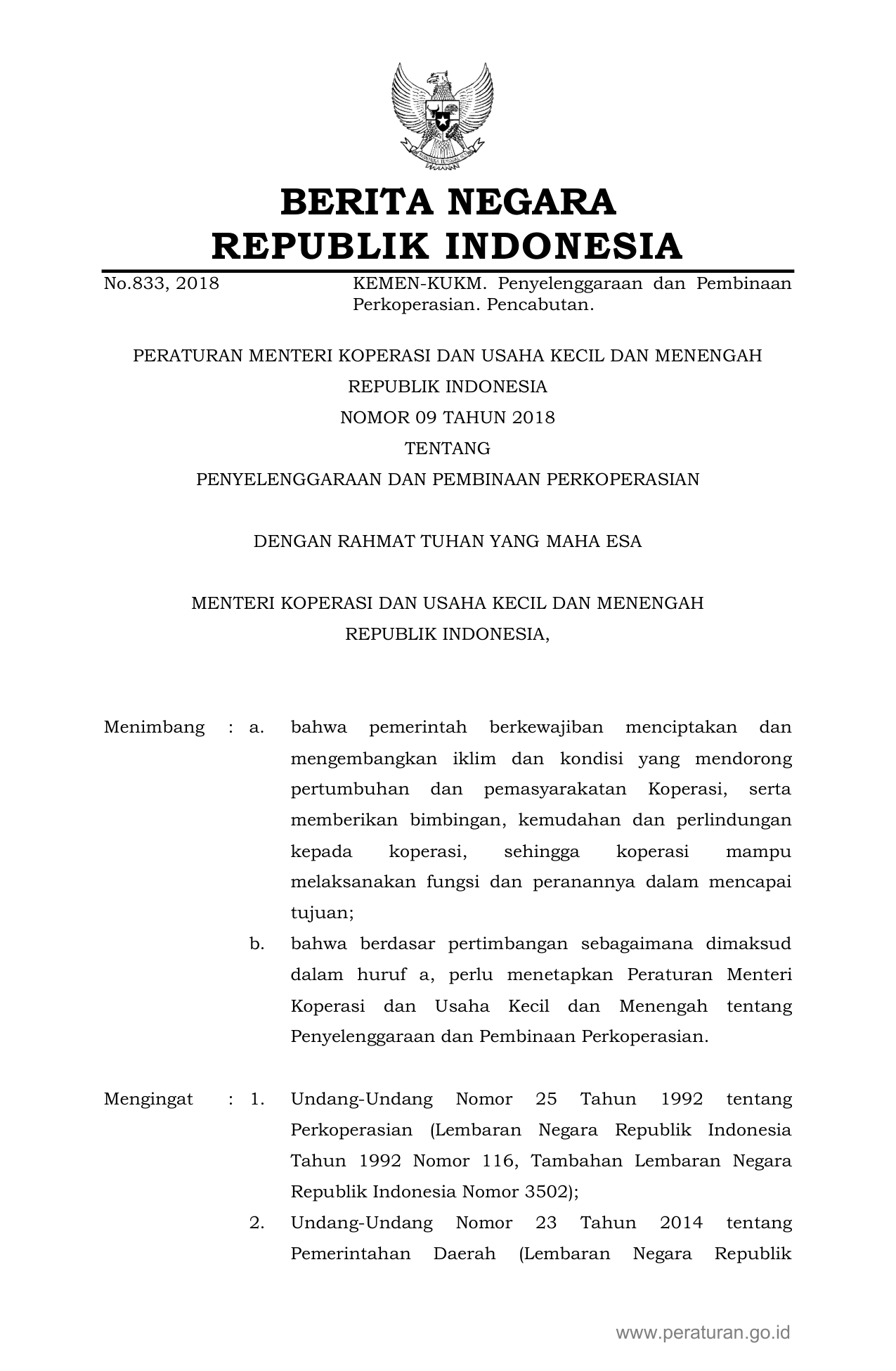 PERMEN Nomor 09 Tahun 2018 | Peraturan Menteri Nomor 09 Tahun 2018 tentang Penyelenggaraan dan Pembinaan Perkoperasian