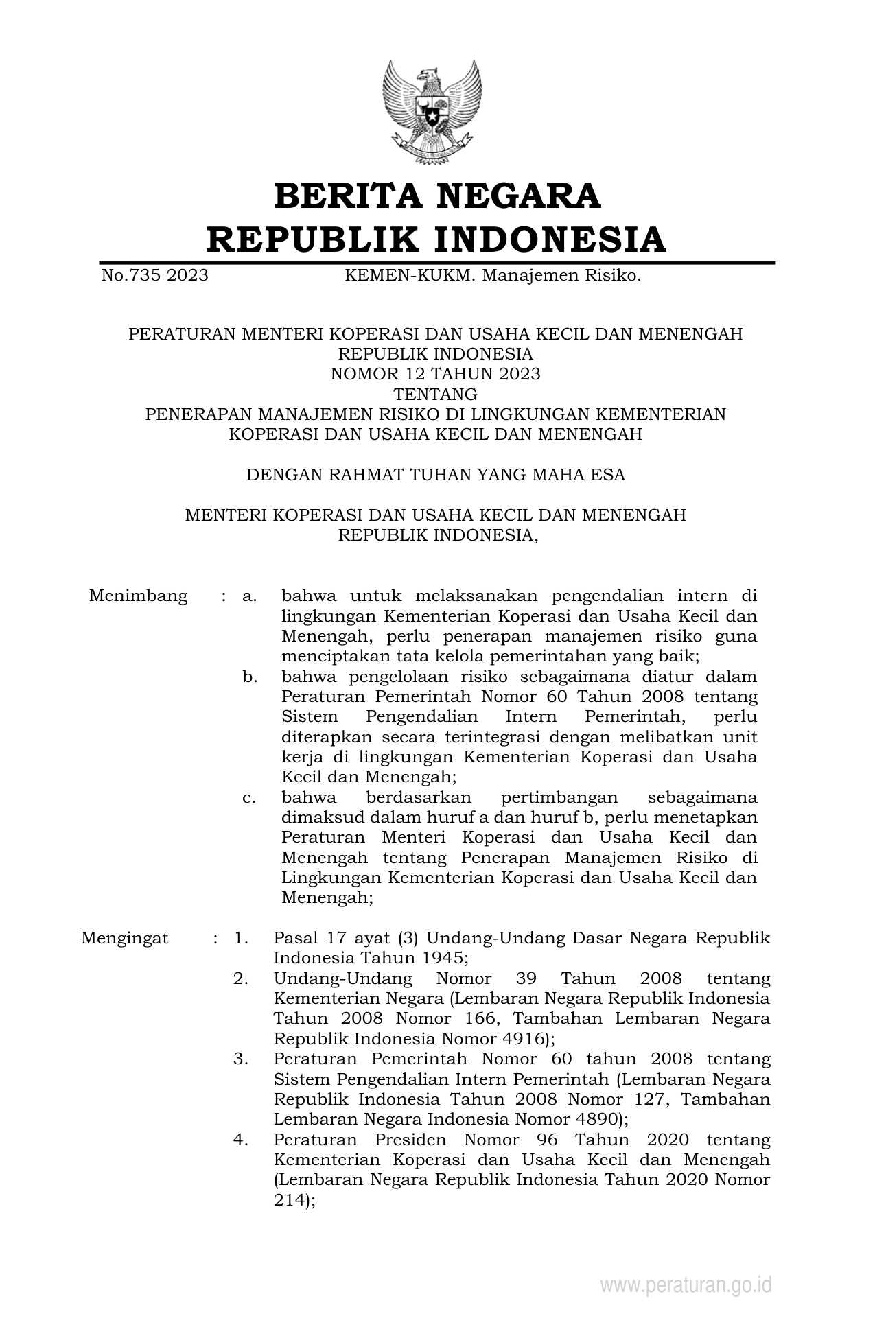 PERMEN Nomor 12 Tahun 2023 | Peraturan Menteri Nomor 12 Tahun 2023 tentang PENERAPAN MANAJEMEN RISIKO DI LINGKUNGAN KEMENTERIAN KOPERASI DAN USAHA KECIL DAN MENENGAH