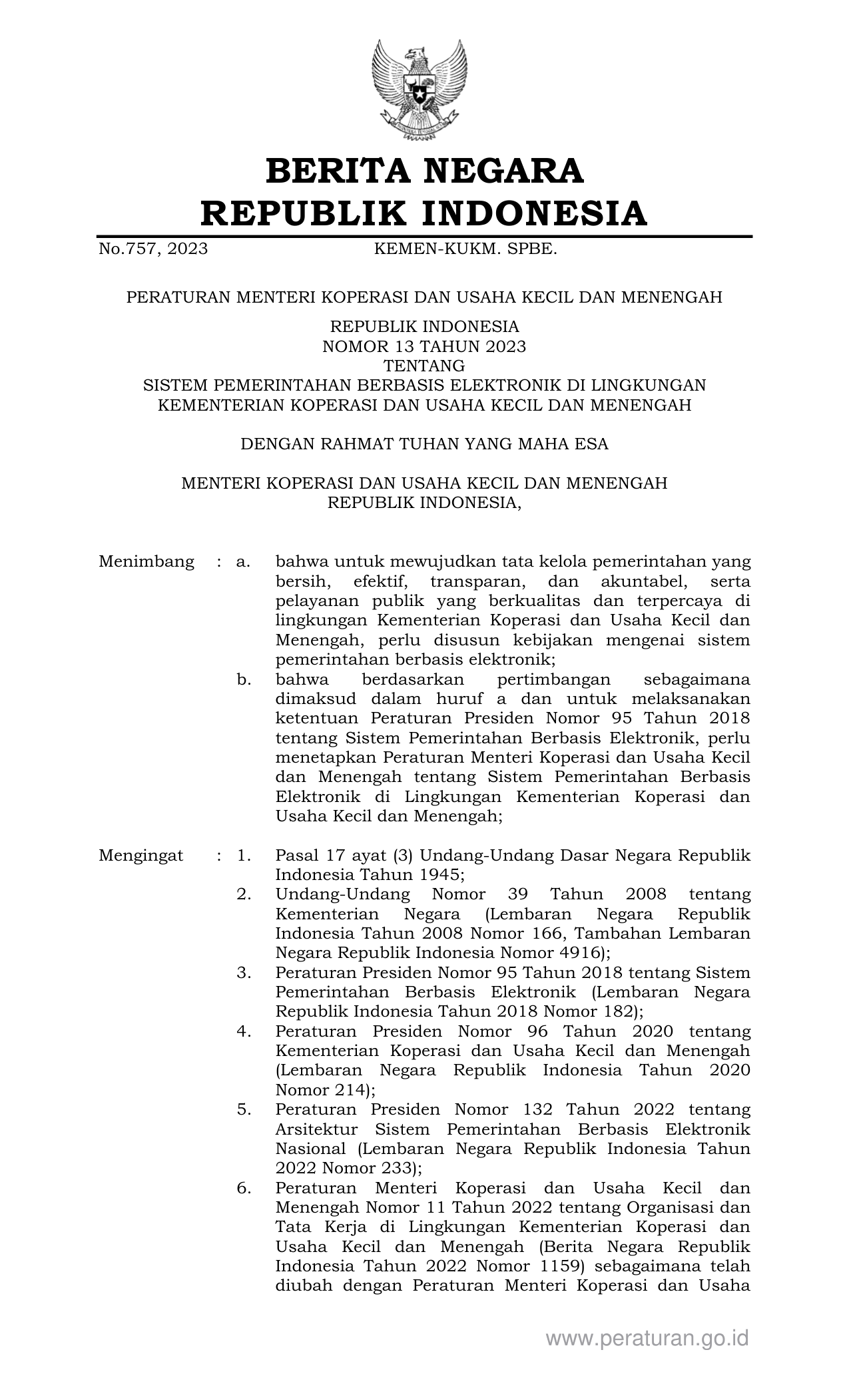 PERMEN Nomor 13 Tahun 2023 | Peraturan Menteri Nomor 13 Tahun 2023 tentang SISTEM PEMERINTAHAN BERBASIS ELEKTRONIK DI LINGKUNGAN KEMENTERIAN KOPERASI DAN USAHA KECIL DAN MENENGAH