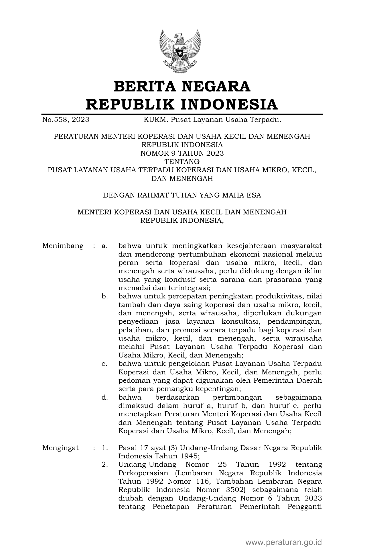 PERMEN Nomor 9 Tahun 2023 | Peraturan Menteri Nomor 9 Tahun 2023 tentang PUSAT LAYANAN USAHA TERPADU KOPERASI DAN USAHA MIKRO, KECIL, DAN MENENGAH