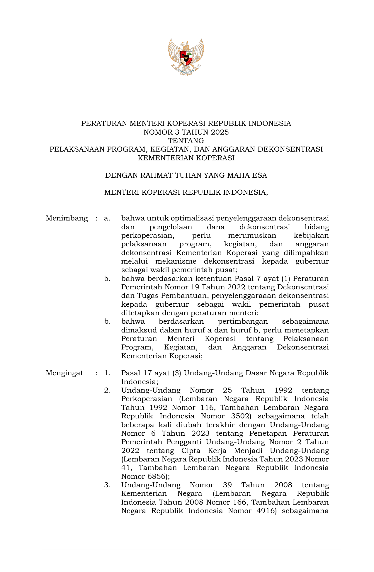 PERMEN Nomor 3 Tahun 2025 | Peraturan Menteri Nomor 3 Tahun 2025 tentang PELAKSANAAN PROGRAM KEGIATAN DAN ANGGARAN DEKONSENTRASI KEMENTERIAN KOPERASI