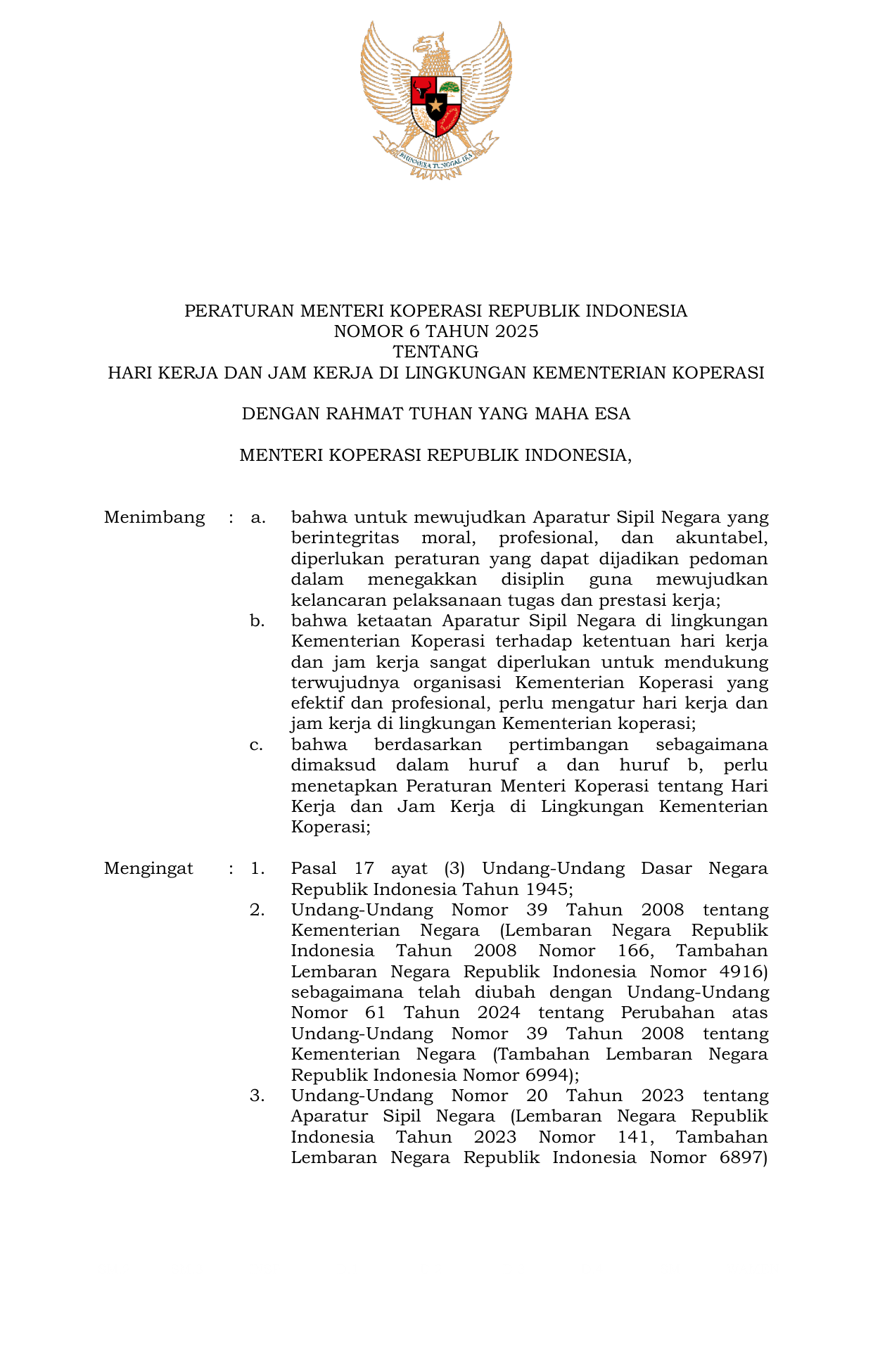 PERMEN Nomor 6 Tahun 2025 | Peraturan Menteri Nomor 6 Tahun 2025 tentang HARI KERJA DAN JAM KERJA DI LINGKUNGAN KEMENTERIAN KOPERASI