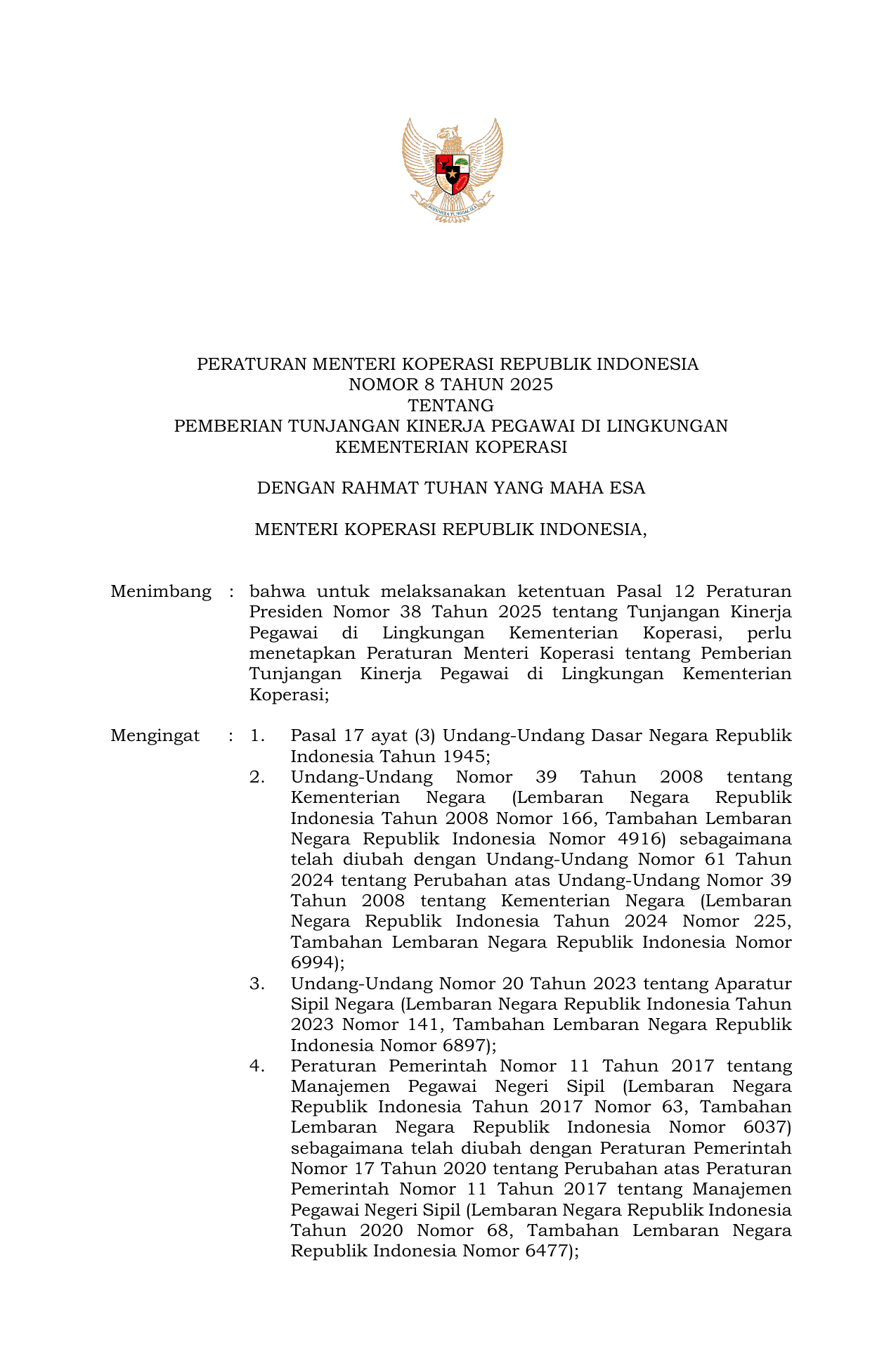 NOMOR 8 TAHUN 2025 TENTANG PEMBERIAN TUNJANGAN KINERJA PEGAWAI DI LINGKUNGAN KEMENTERIAN KOPERASI