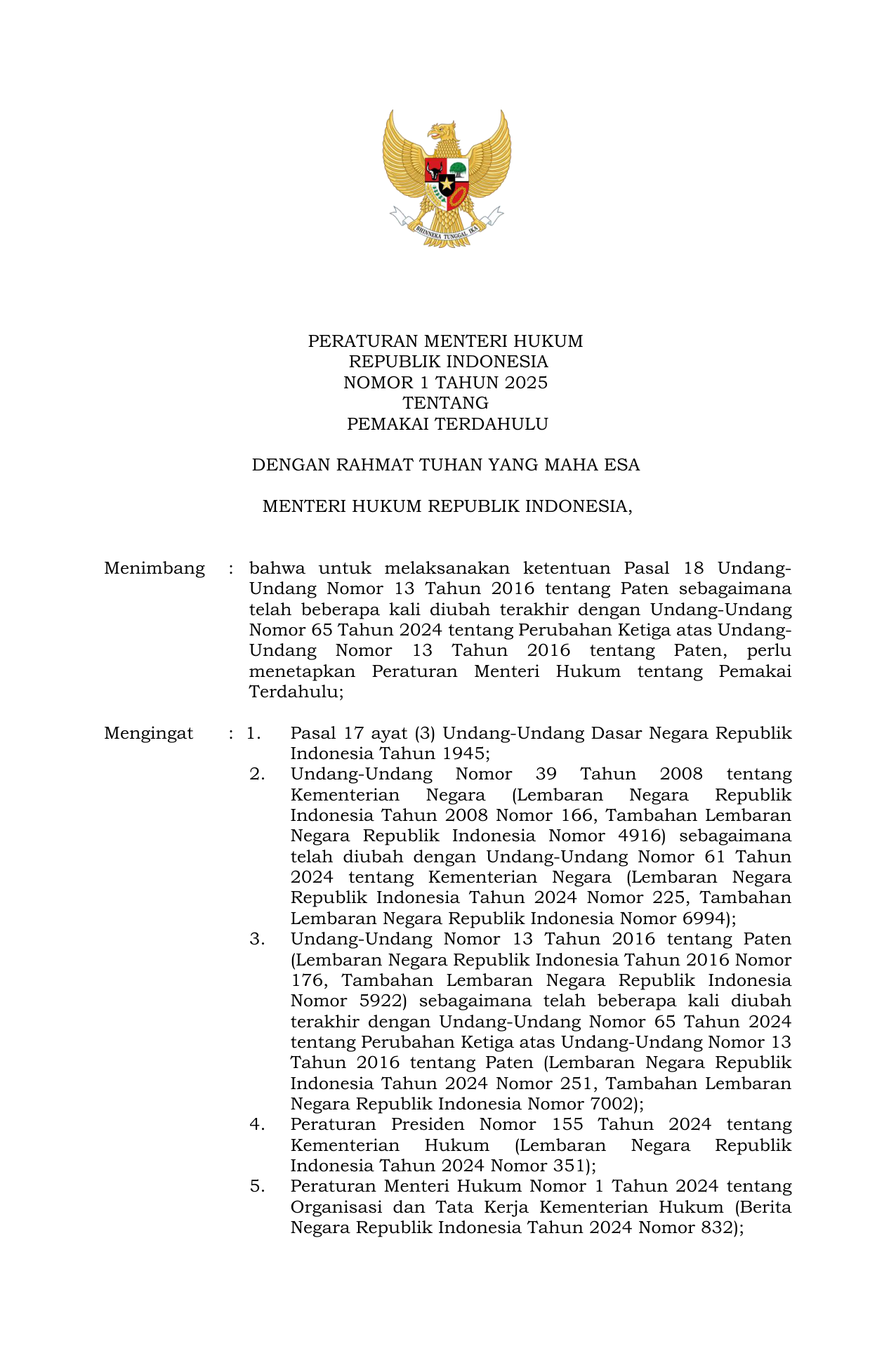 PERMEN Nomor 1 Tahun 2025 | Peraturan Menteri Nomor 1 Tahun 2025 tentang PEMAKAI TERDAHULU