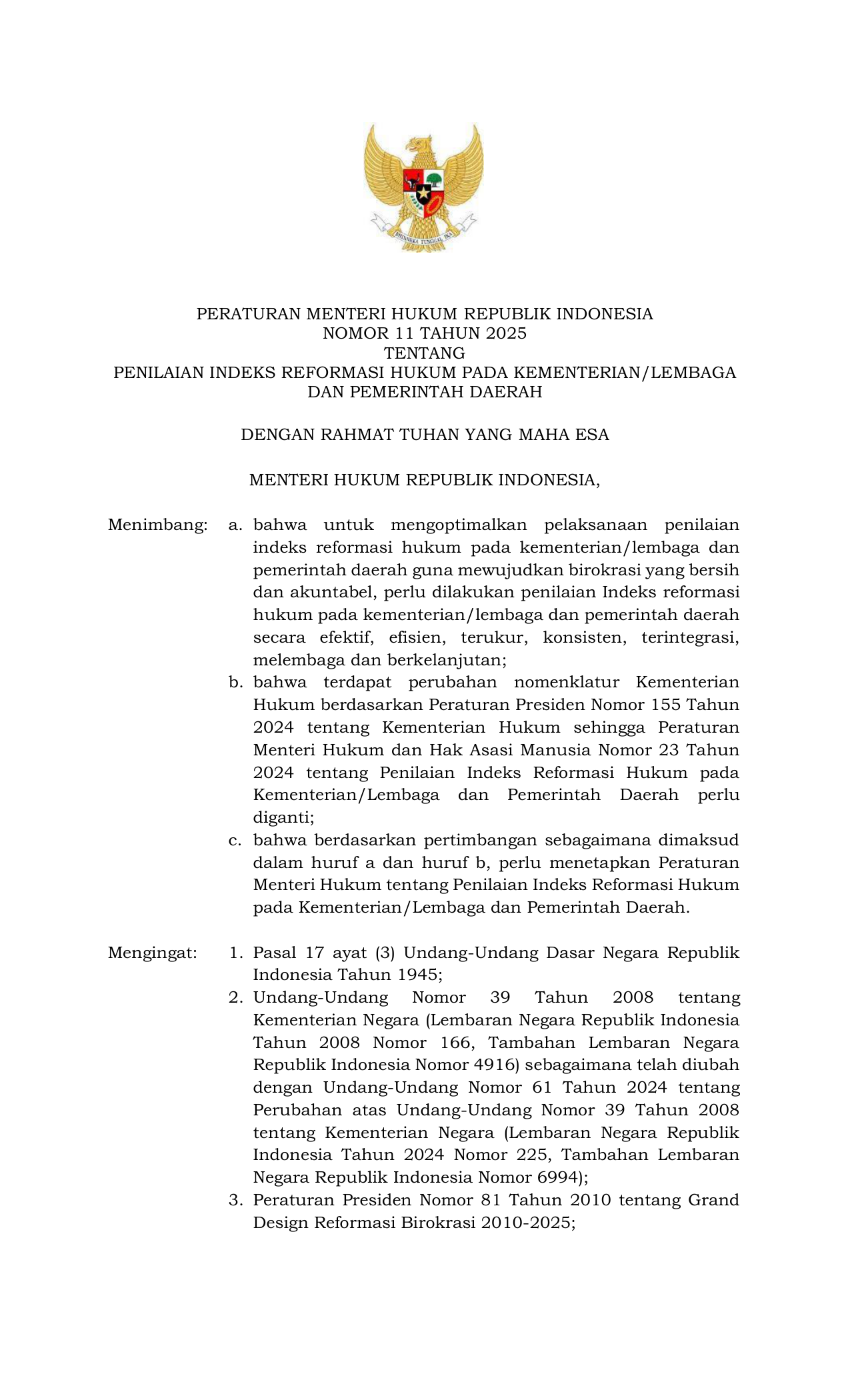 PERMEN Nomor 11 Tahun 2025 | Peraturan Menteri Nomor 11 Tahun 2025 tentang PENILAIAN INDEKS REFORMASI HUKUM PADA KEMENTERIAN LEMBAGA DAN PEMERINTAH DAERAH