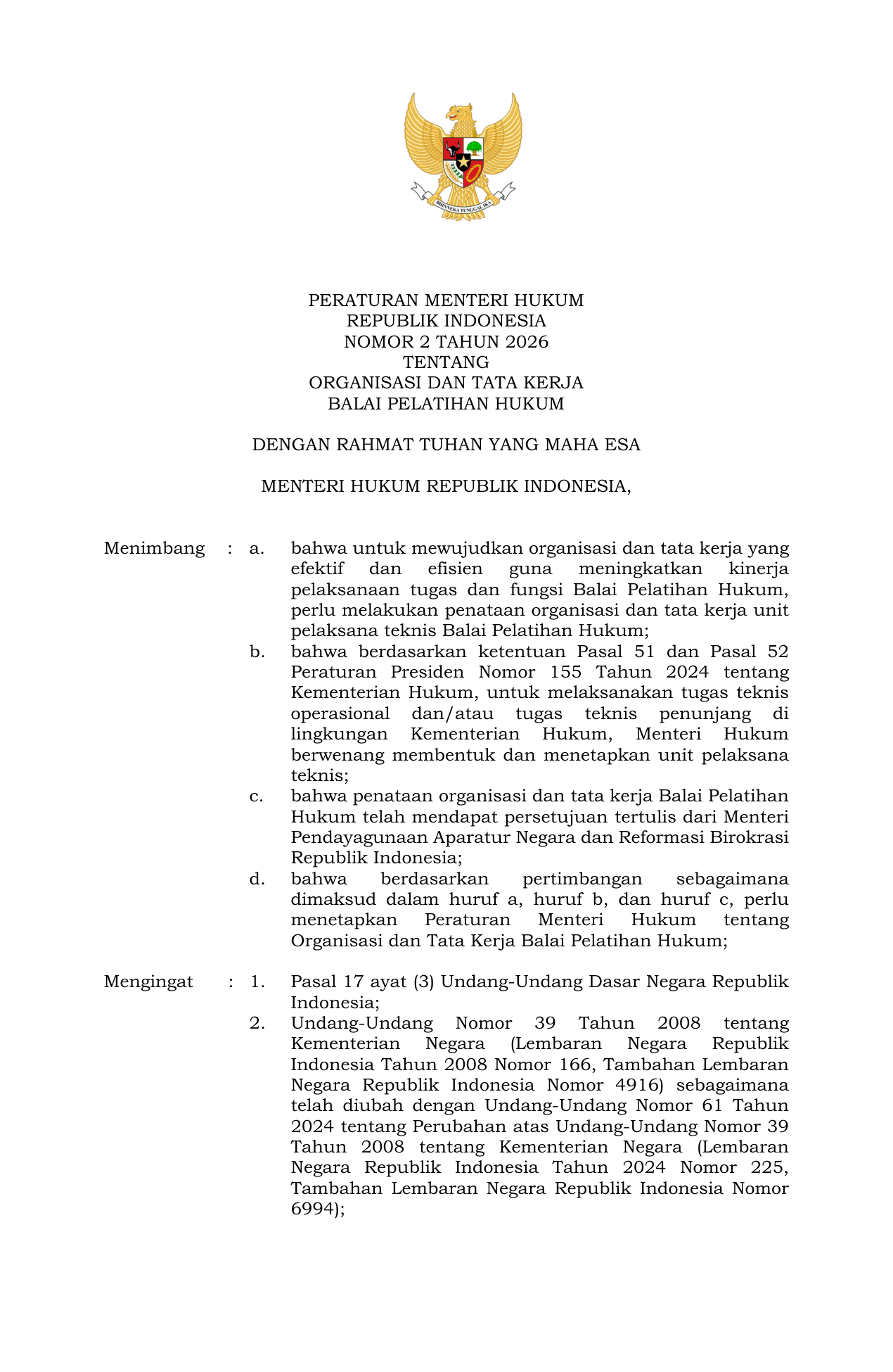 PERMEN Nomor 2 Tahun 2026 | Peraturan Menteri Nomor 2 Tahun 2026 tentang ORGANISASI DAN TATA KERJA BALAI PELATIHAN HUKUM