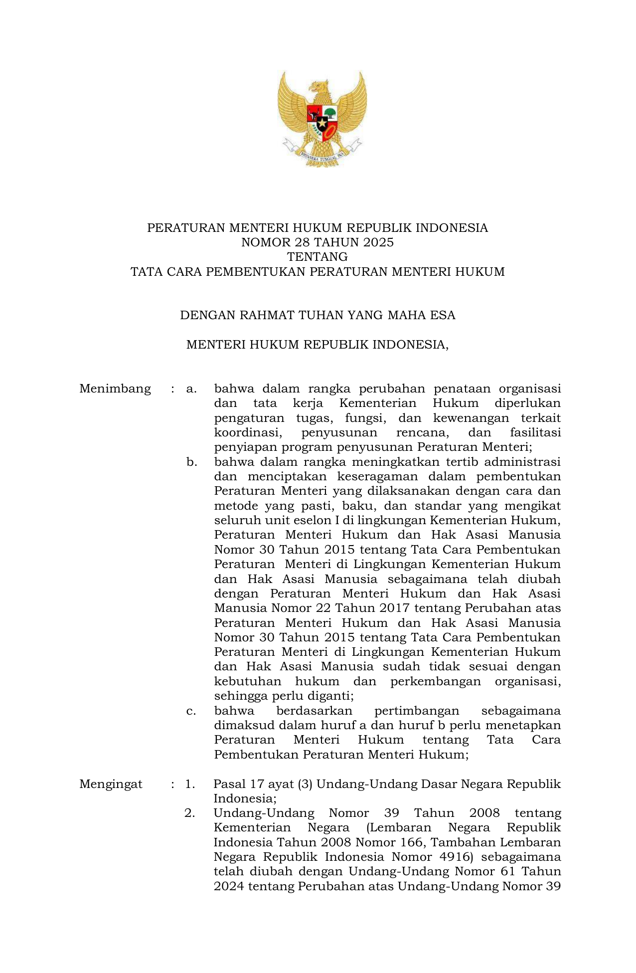 PERMEN Nomor 28 Tahun 2025 | Peraturan Menteri Nomor 28 Tahun 2025 tentang TATA CARA PEMBENTUKAN PERATURAN MENTERI HUKUM