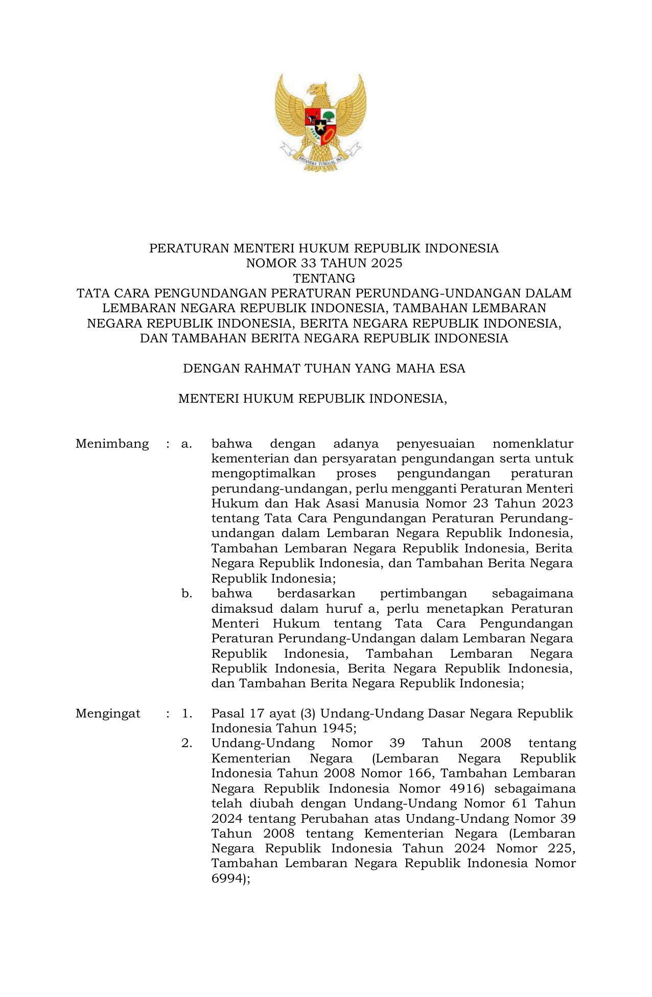 PERMEN Nomor 33 Tahun 2025 | Peraturan Menteri Nomor 33 Tahun 2025 tentang TATA CARA PENGUNDANGAN PERATURAN PERUNDANG UNDANGAN DALAM LEMBARAN NEGARA REPUBLIK INDONESIA TAMBAHAN LEMBARAN NEGARA REPUBLIK INDONESIA BERITA NEGARA REPUBLIK INDONESIA DAN TAMBAHAN BERITA NEGARA REPUBLIK INDONESIA