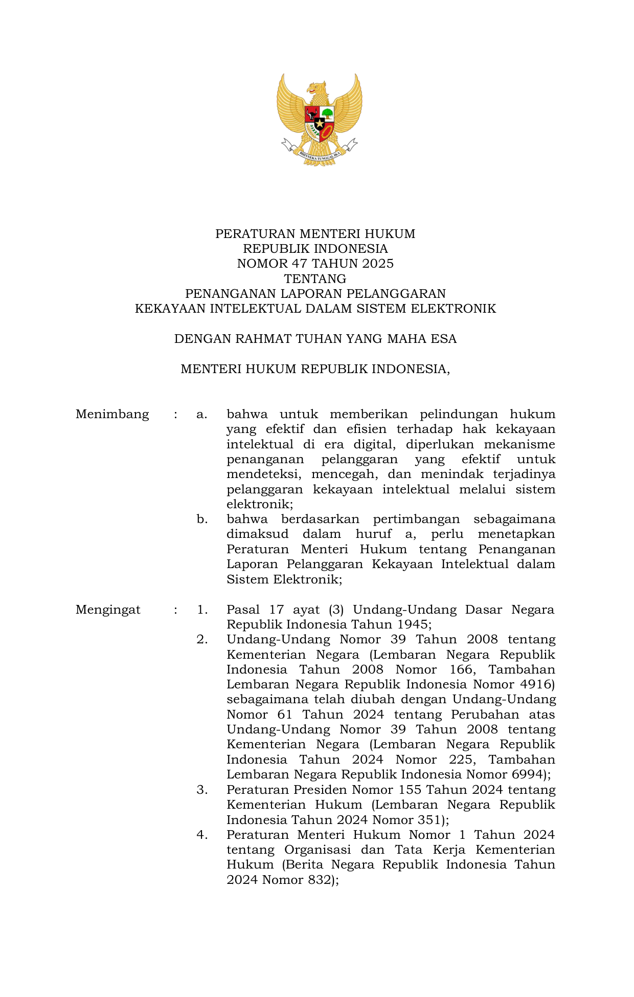PERMEN Nomor 47 Tahun 2025 | Peraturan Menteri Nomor 47 Tahun 2025 tentang PENANGANAN LAPORAN PELANGGARAN KEKAYAAN INTELEKTUAL DALAM SISTEM ELEKTRONIK