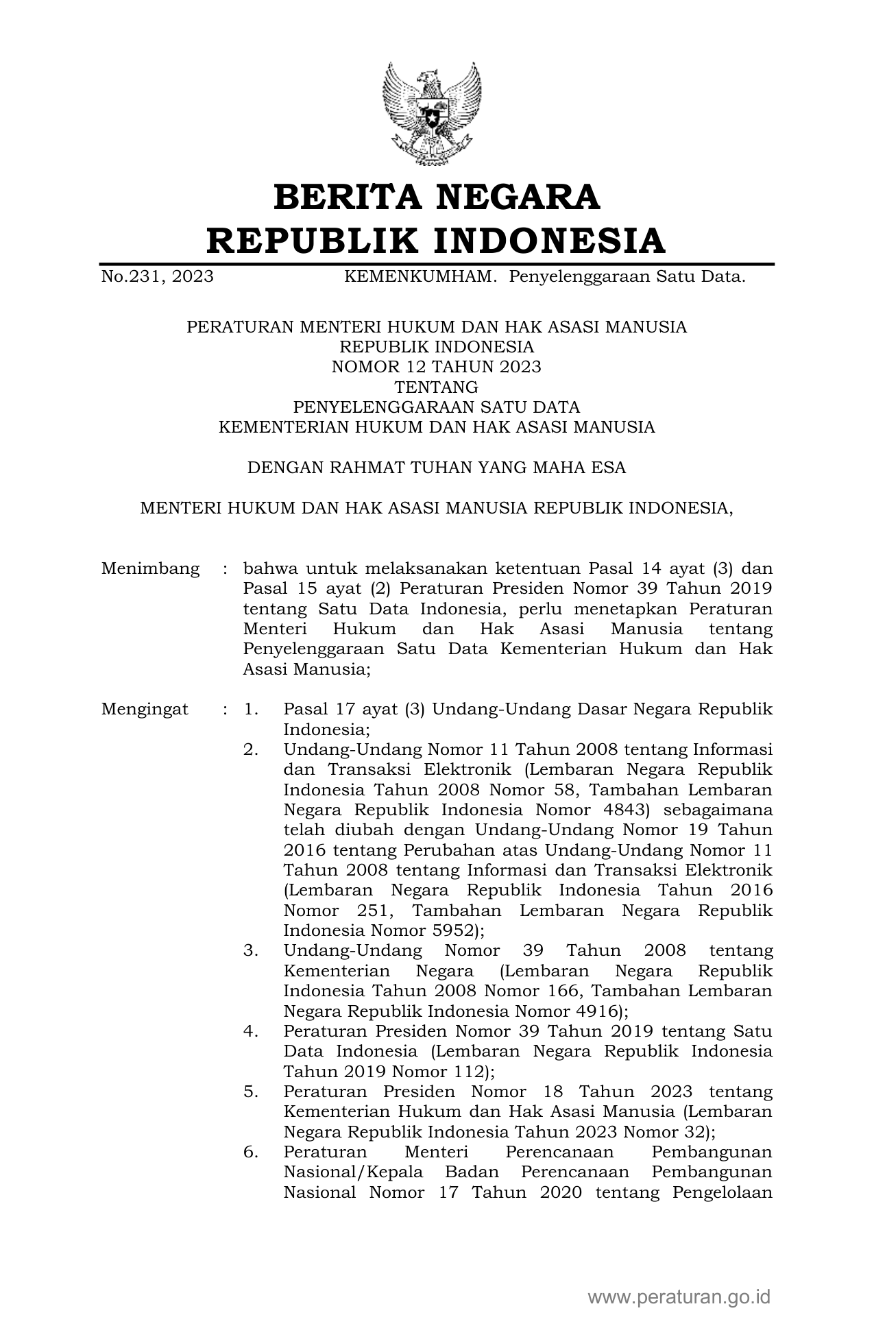PERMEN Nomor 12 Tahun 2023 | Peraturan Menteri Nomor 12 Tahun 2023 tentang PENYELENGGARAAN SATU DATAKEMENTERIAN HUKUM DAN HAK ASASI MANUSIA