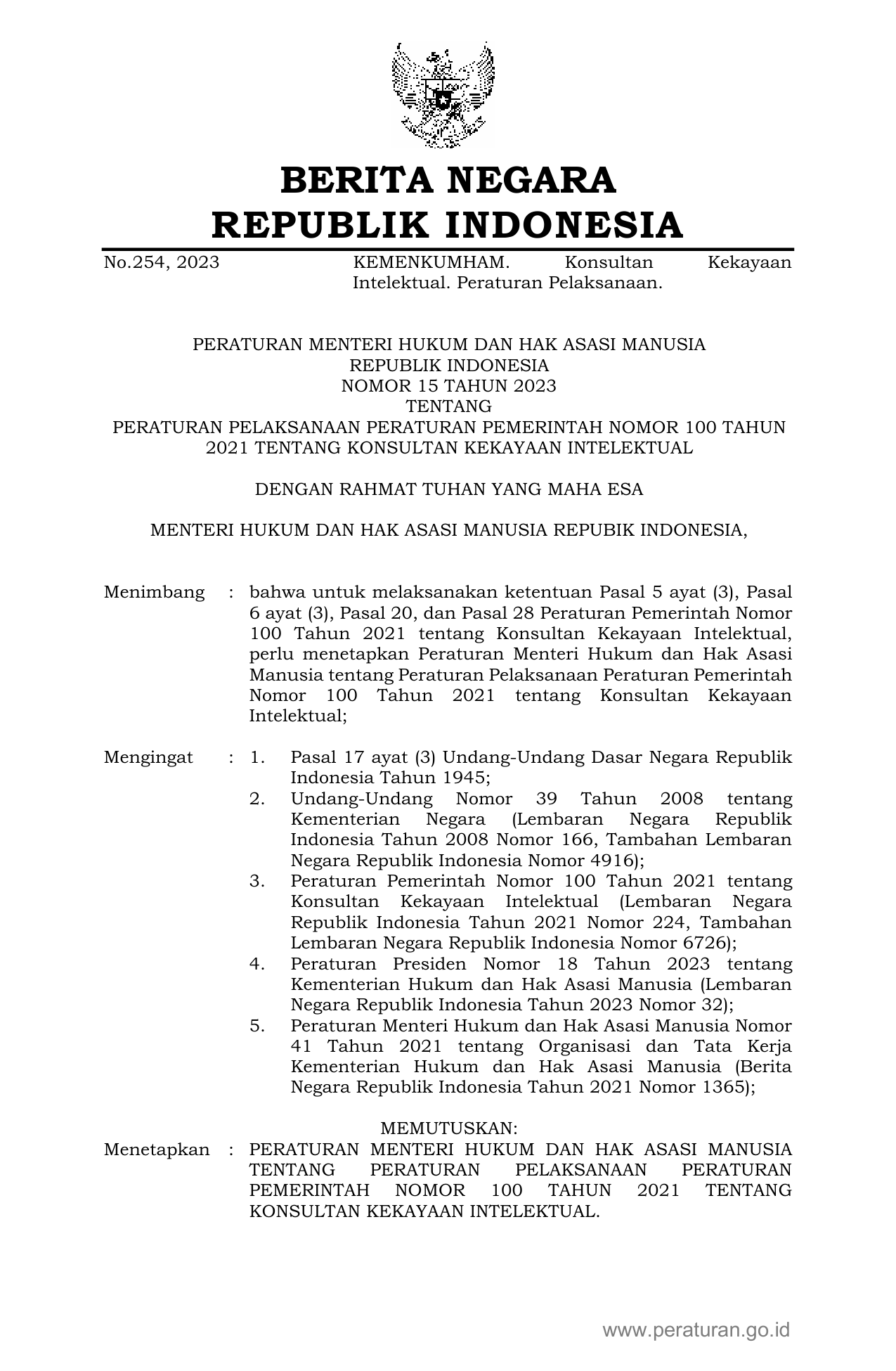 PERMEN Nomor 15 Tahun 2023 | Peraturan Menteri Nomor 15 Tahun 2023 tentang PERATURAN PELAKSANAAN PERATURAN PEMERINTAH NOMOR 100 TAHUN 2021 TENTANG KONSULTAN KEKAYAAN INTELEKTUAL