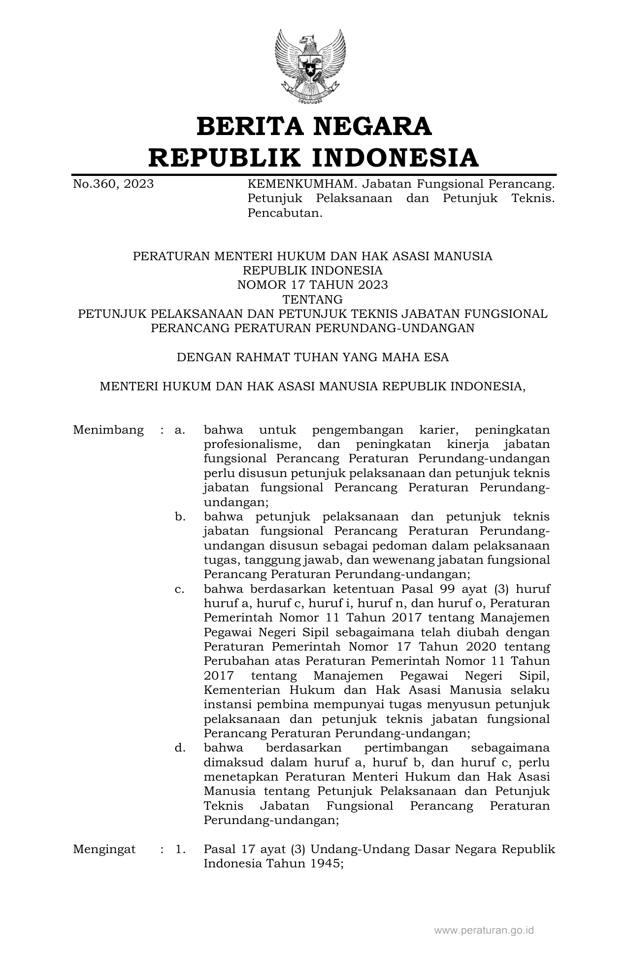 PERMEN Nomor 17 Tahun 2023 | Peraturan Menteri Nomor 17 Tahun 2023 tentang PETUNJUK PELAKSANAAN DAN PETUNJUK TEKNIS JABATAN FUNGSIONAL PERANCANG PERATURAN PERUNDANG-UNDANGAN
