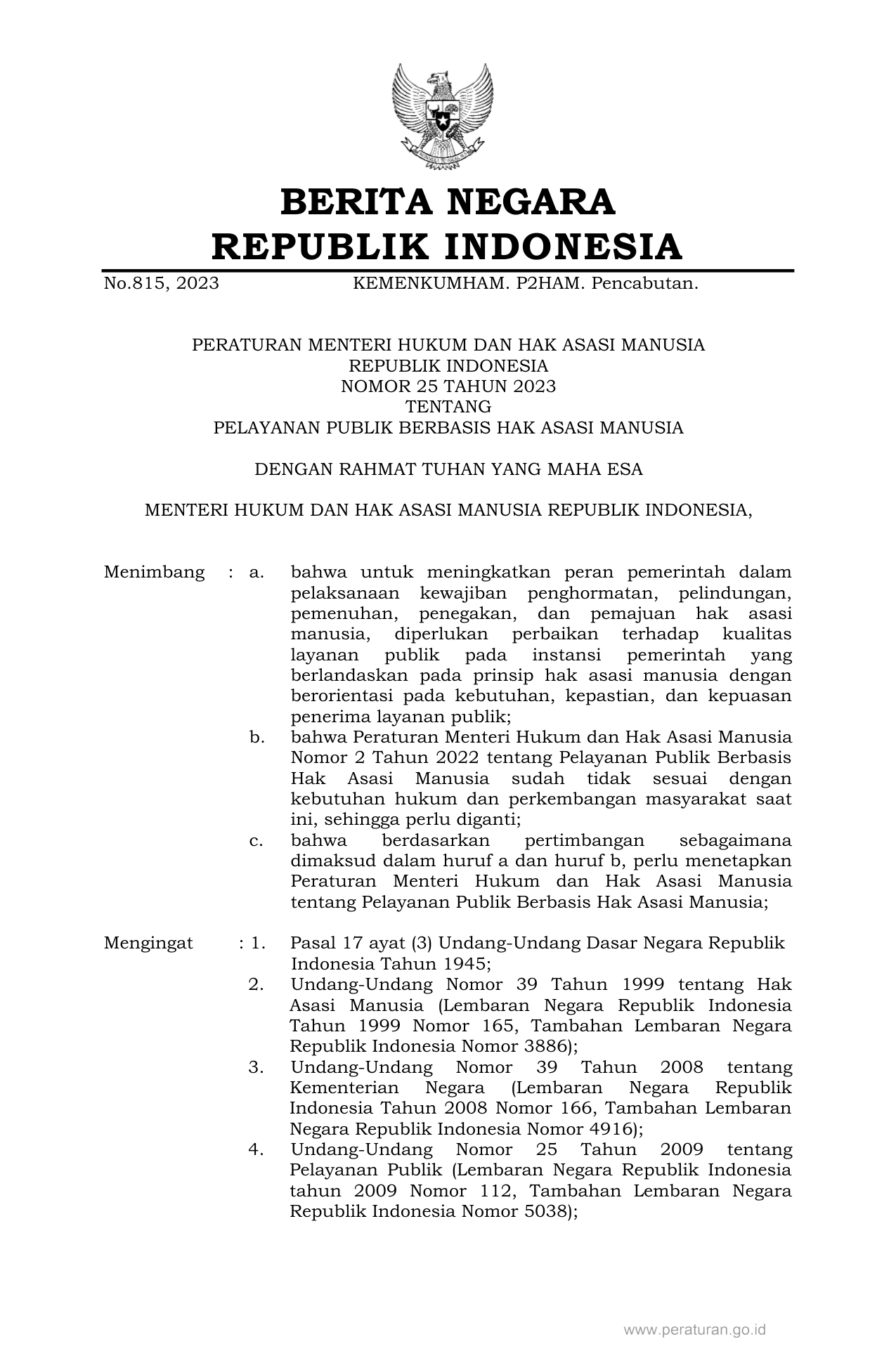 PERMEN Nomor 25 Tahun 2023 | Peraturan Menteri Nomor 25 Tahun 2023 tentang PELAYANAN PUBLIK BERBASIS HAK ASASI MANUSIA
