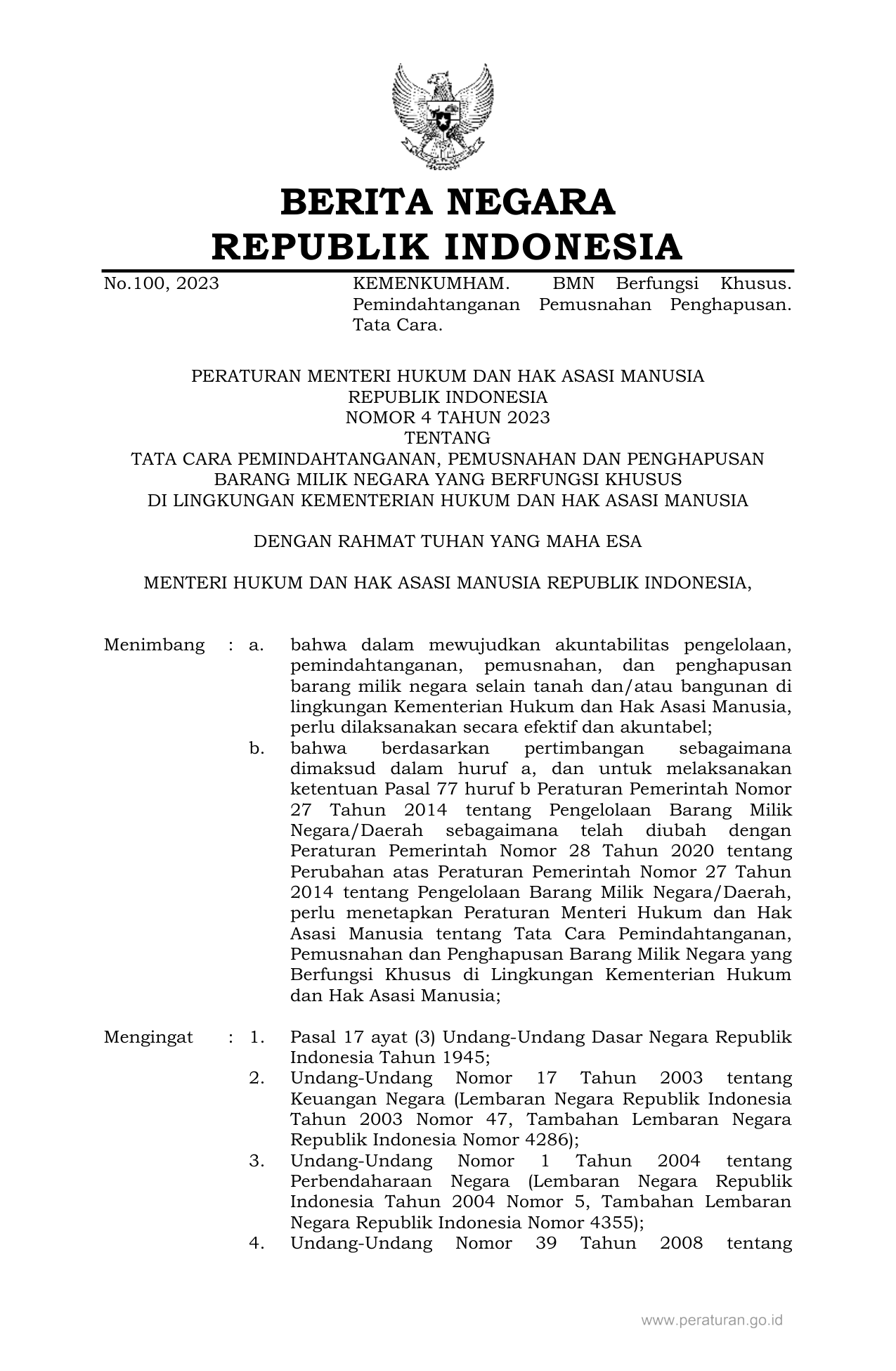 PERMEN Nomor 4 Tahun 2023 | Peraturan Menteri Nomor 4 Tahun 2023 tentang TATA CARA PEMINDAHTANGANAN, PEMUSNAHAN DAN PENGHAPUSAN BARANG MILIK NEGARA YANG BERFUNGSI KHUSUS DI LINGKUNGAN KEMENTERIAN HUKUM DAN HAK ASASI MANUSIA
