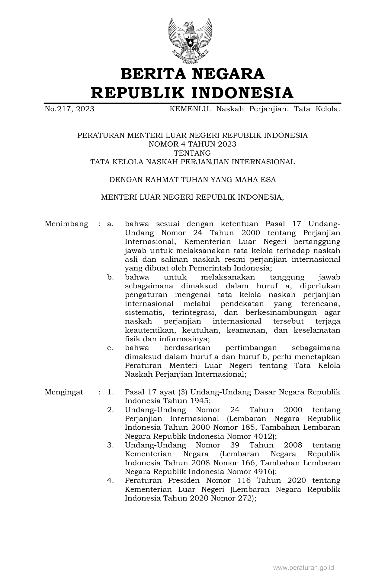 PERMEN Nomor 4 Tahun 2023 | Peraturan Menteri Nomor 4 Tahun 2023 tentang TATA KELOLA NASKAH PERJANJIAN INTERNASIONAL
