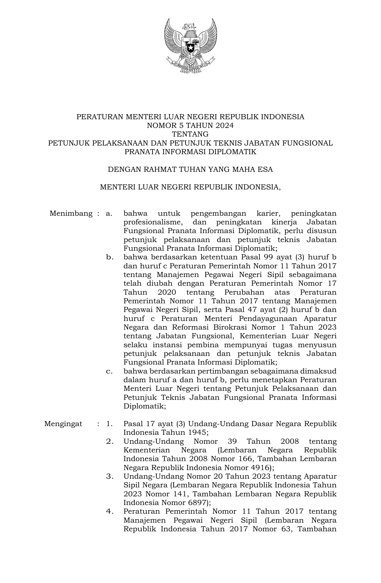 PERMEN Nomor 5 Tahun 2024 | Peraturan Menteri Nomor 5 Tahun 2024 tentang Petunjuk Pelaksanaan dan Petunjuk Teknis Jabatan Fungsional Pranata Informasi Diplomatik