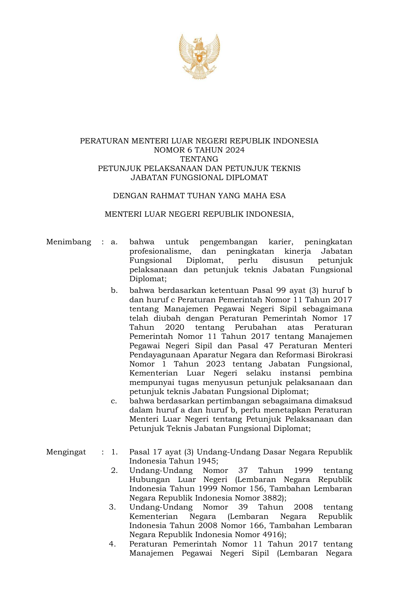 PERMEN Nomor 6 Tahun 2024 | Peraturan Menteri Nomor 6 Tahun 2024 tentang Petunjuk Pelaksanaan dan Petunjuk Teknis Jabatan Fungsional Diplomat