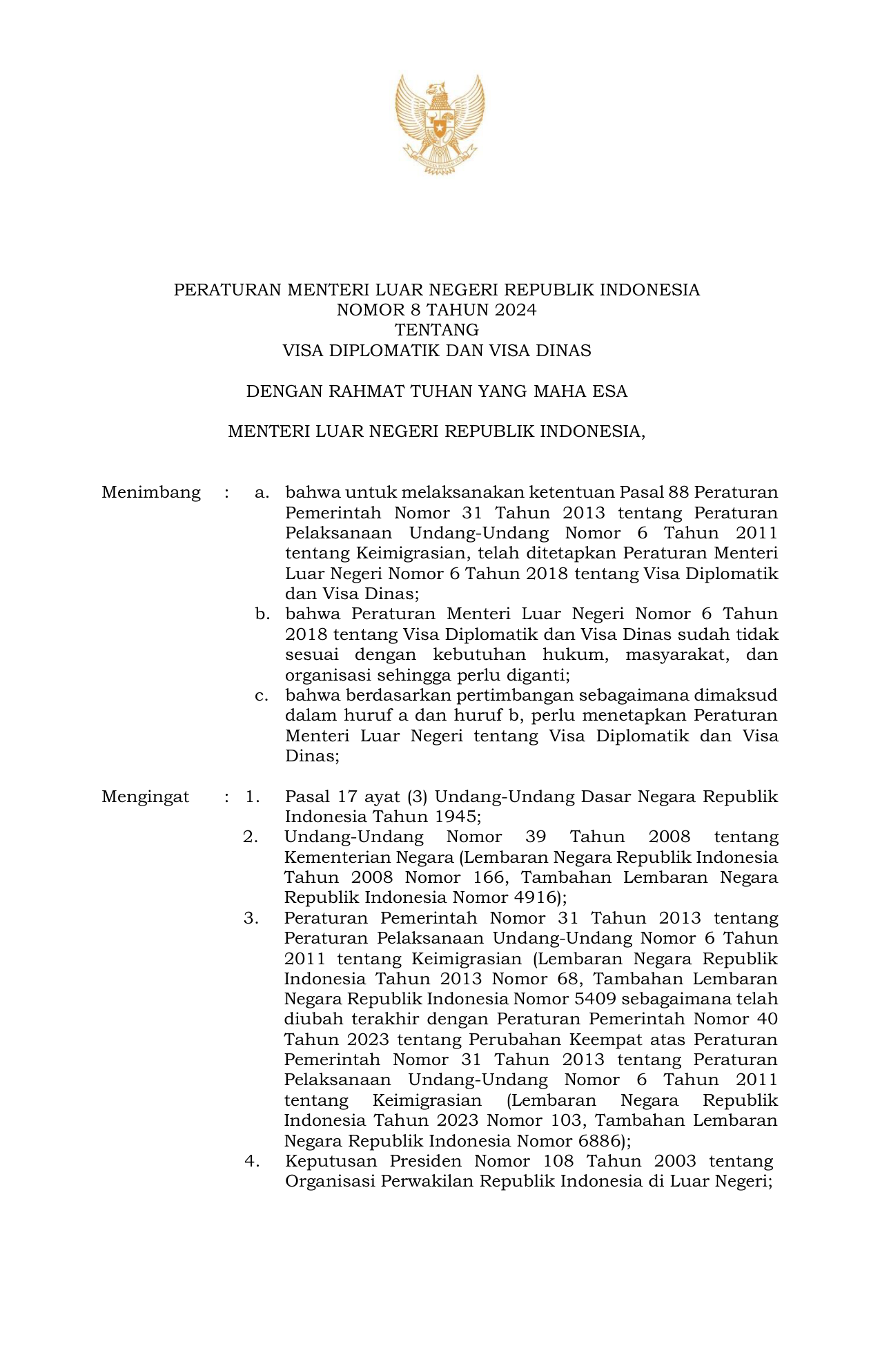 PERMEN Nomor 8 Tahun 2024 | Peraturan Menteri Nomor 8 Tahun 2024 tentang Visa Diplomatik dan Visa Dinas