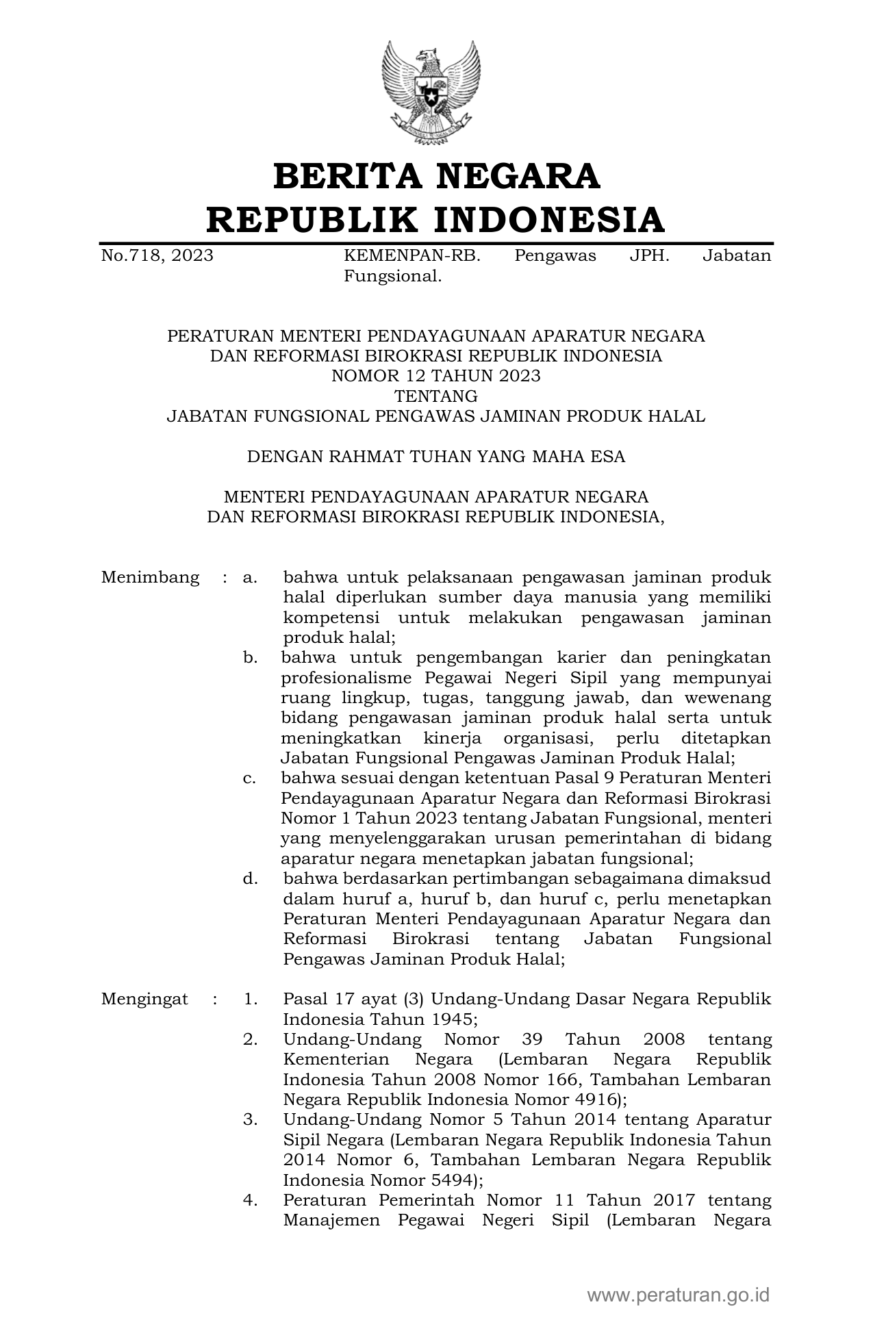 PERMEN Nomor 12 Tahun 2023 | Peraturan Menteri Nomor 12 Tahun 2023 tentang JABATAN FUNGSIONAL PENGAWAS JAMINAN PRODUK HALAL