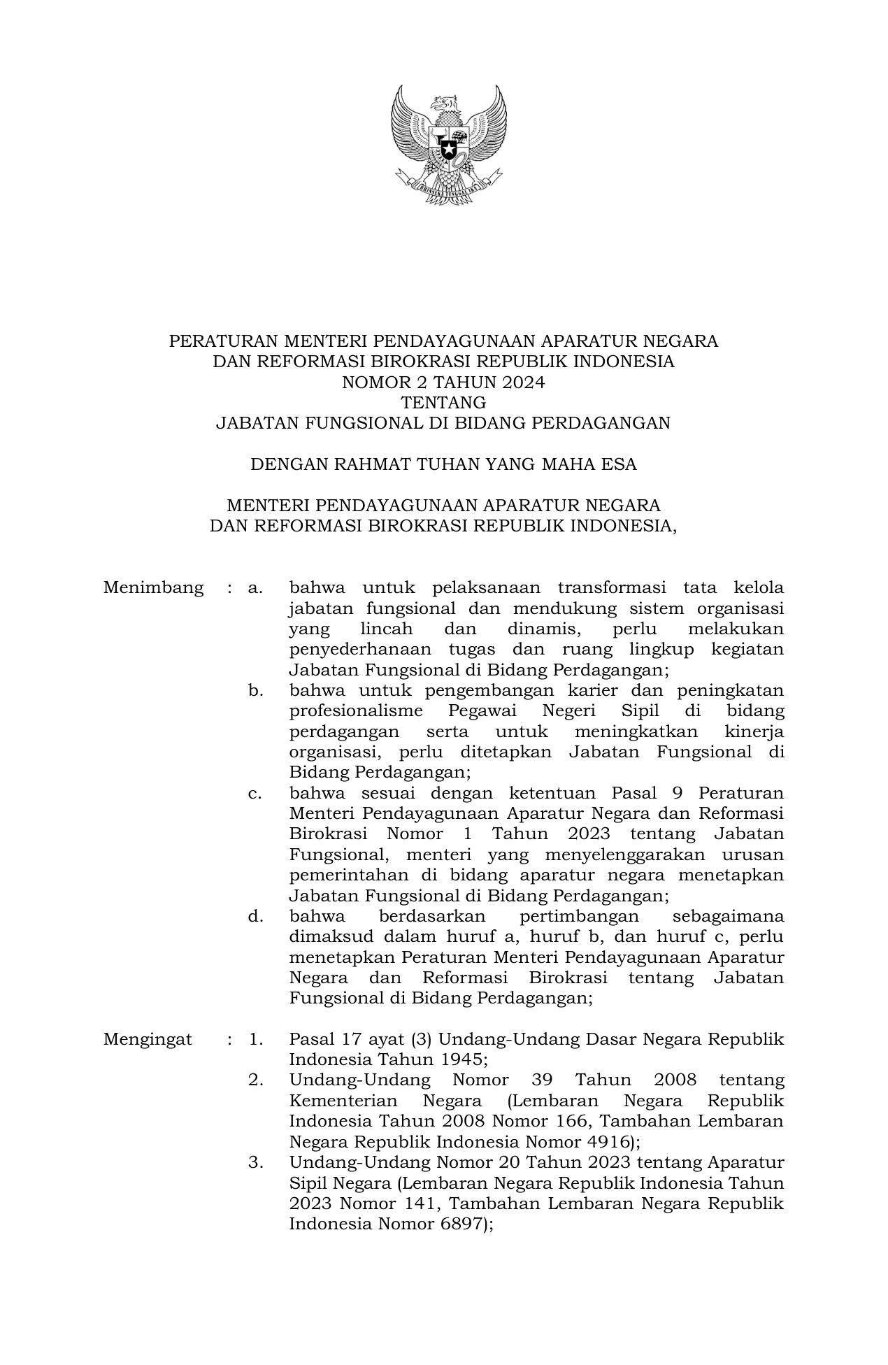 PERMEN Nomor 2 Tahun 2024 | Peraturan Menteri Nomor 2 Tahun 2024 tentang JABATAN FUNGSIONAL DI BIDANG PERDAGANGAN
