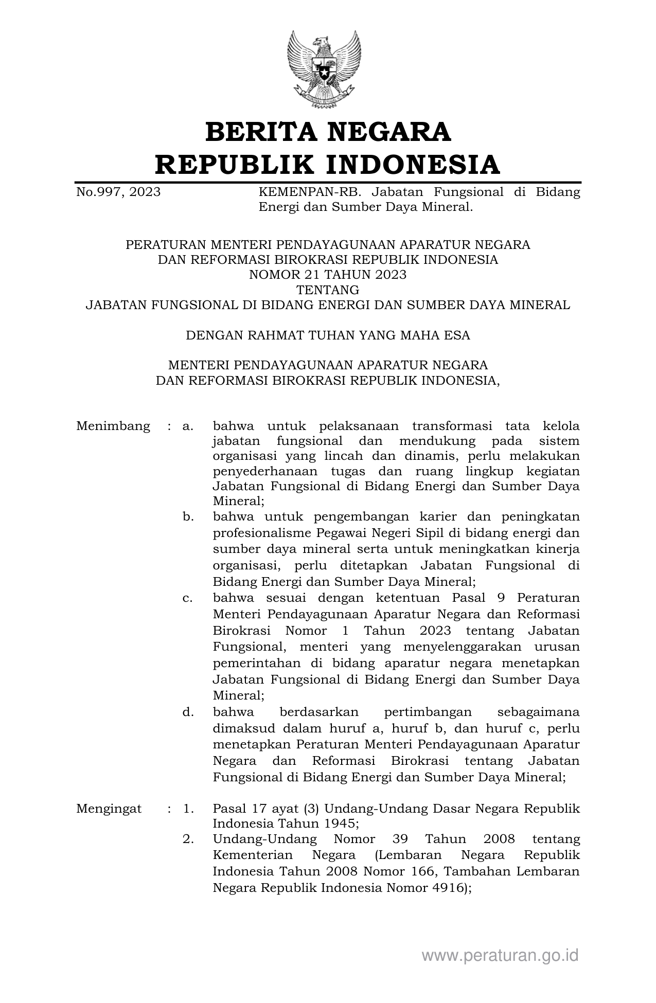 PERMEN Nomor 21 Tahun 2023 | Peraturan Menteri Nomor 21 Tahun 2023 tentang JABATAN FUNGSIONAL DI BIDANG ENERGI DAN SUMBER DAYA MINERAL
