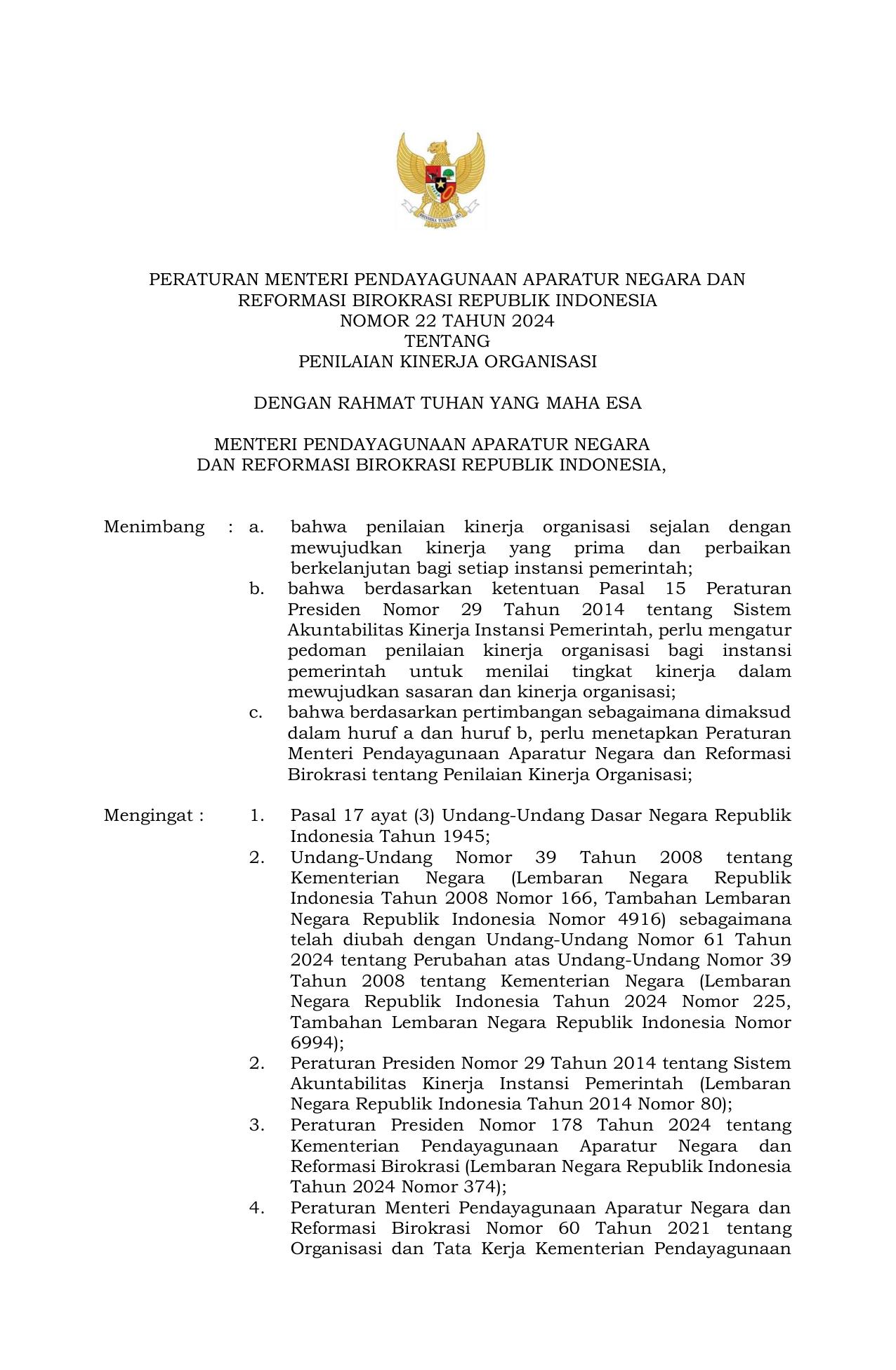 PERMEN Nomor 22 Tahun 2024 | Peraturan Menteri Nomor 22 Tahun 2024 tentang Penilaian Kinerja Organisasi