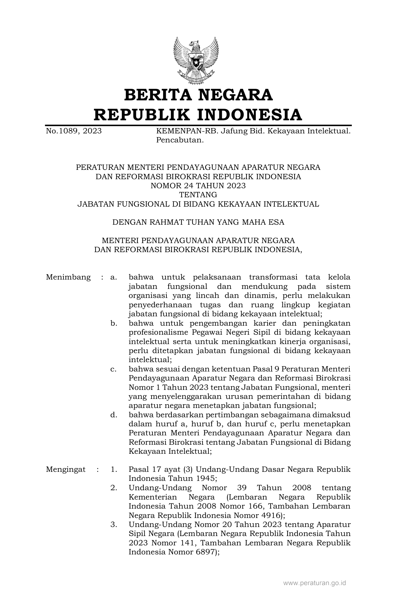 PERMEN Nomor 24 Tahun 2023 | Peraturan Menteri Nomor 24 Tahun 2023 tentang JABATAN FUNGSIONAL DI BIDANG KEKAYAAN INTELEKTUAL