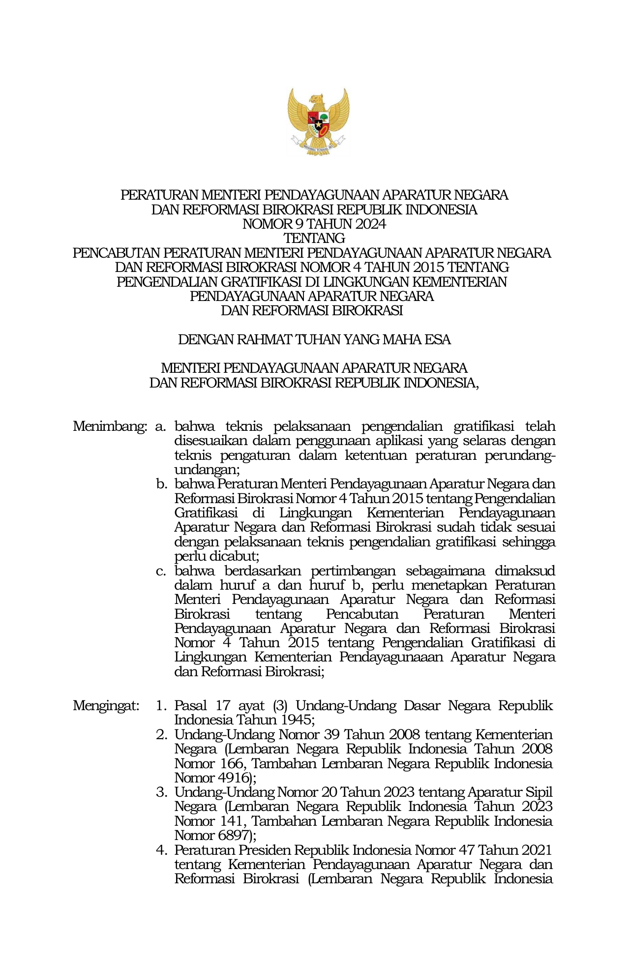 PERMEN Nomor 9 Tahun 2024 | Peraturan Menteri Nomor 9 Tahun 2024 tentang PENCABUTAN PERATURAN MENTERI PENDAYAGUNAAN APARATUR NEGARA DAN REFORMASI BIROKRASI NOMOR 4 TAHUN 2015 TENTANG PENGENDALIAN GRATIFIKASI DI LINGKUNGAN KEMENTERIAN PENDAYAGUNAAN APARATUR NEGARA DAN REFORMASI BIROKRASI