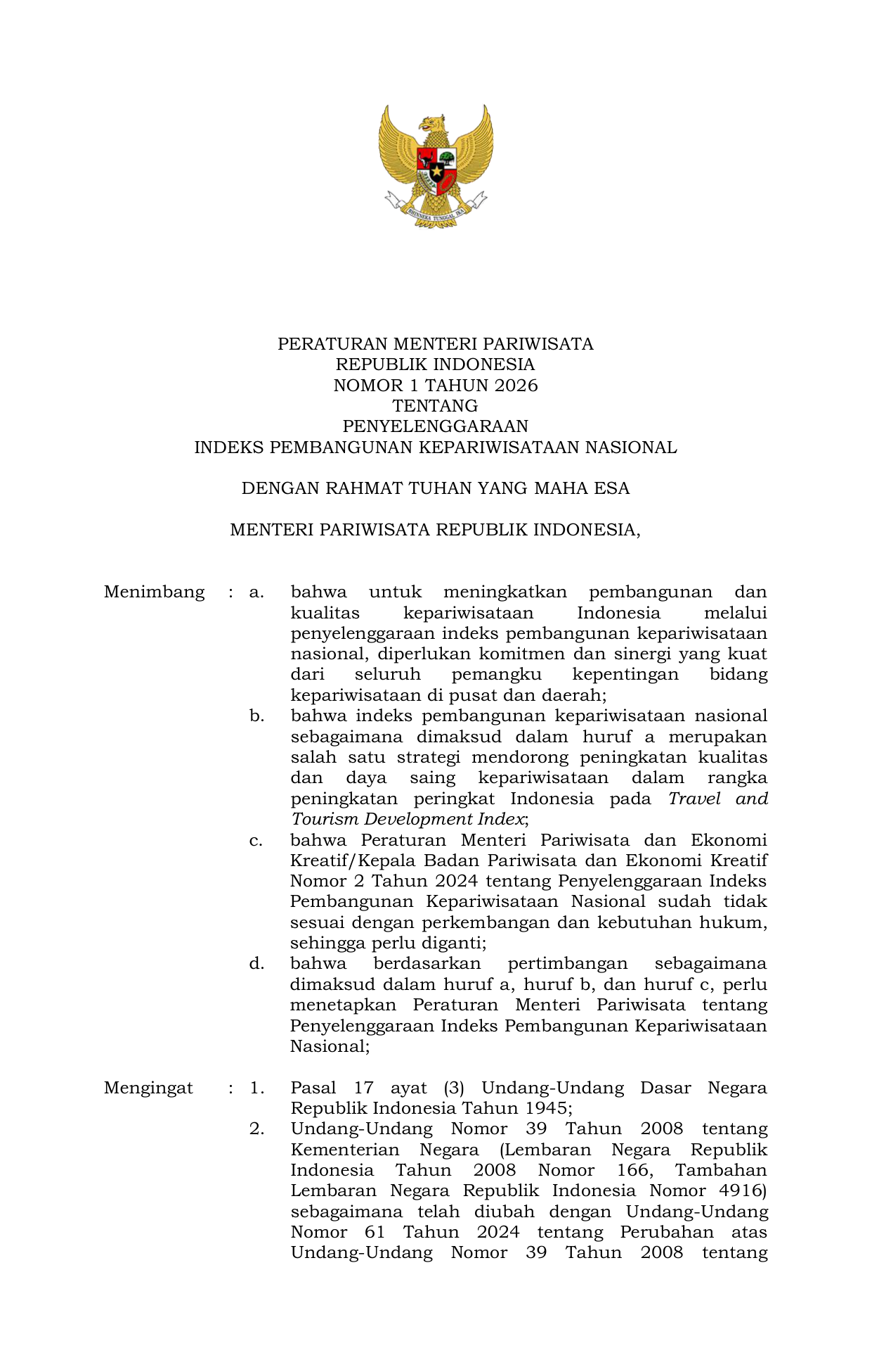PERMEN Nomor 1 Tahun 2026 | Peraturan Menteri Nomor 1 Tahun 2026 tentang Penyelenggaraan Indeks Pembangunan Kepariwisataan Nasional