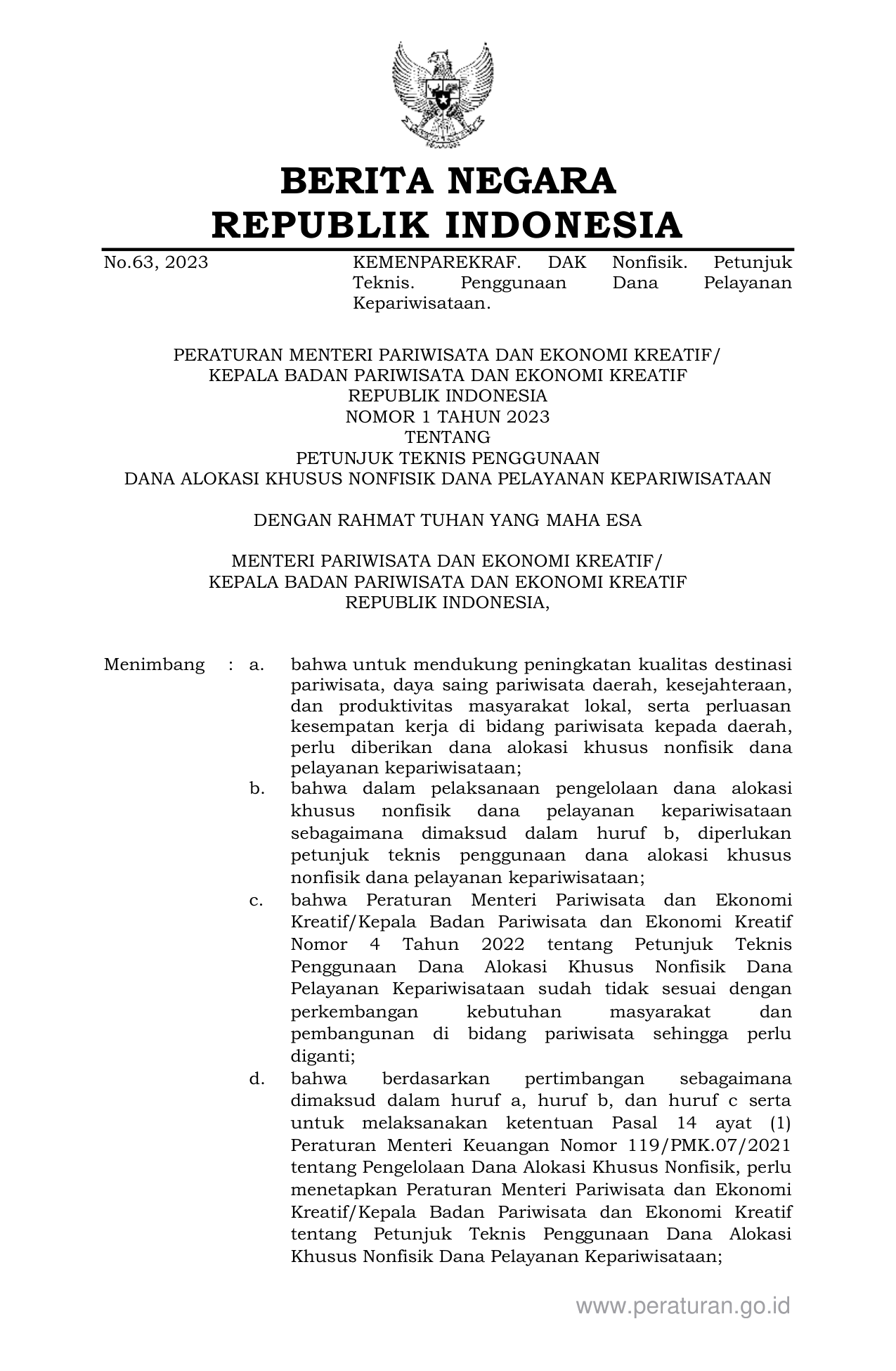 PERMEN Nomor 1 Tahun 2023 | Peraturan Menteri Nomor 1 Tahun 2023 tentang PETUNJUK TEKNIS PENGGUNAAN DANA ALOKASI KHUSUS NONFISIK DANA PELAYANAN KEPARIWISATAAN