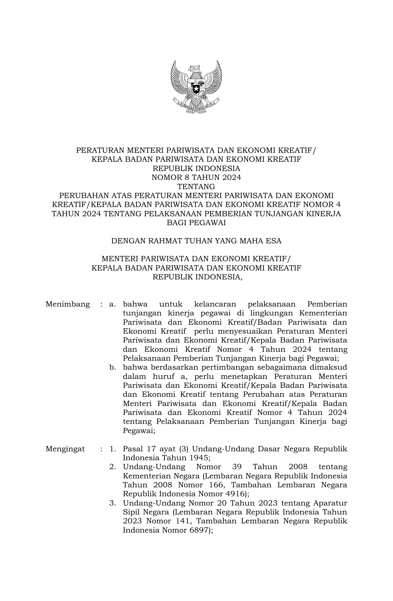 PERMEN Nomor 8 Tahun 2024 | Peraturan Menteri Nomor 8 Tahun 2024 tentang Perubahan Atas Peraturan Menteri Pariwisata dan Ekonomi Kreatif/Kepala Badan Pariwisata dan Ekonomi Kreatif Nomor 4 Tahun 2024 tentang Pelaksanaan Pemberian Tunjangan Kinerja Bagi Pegawai