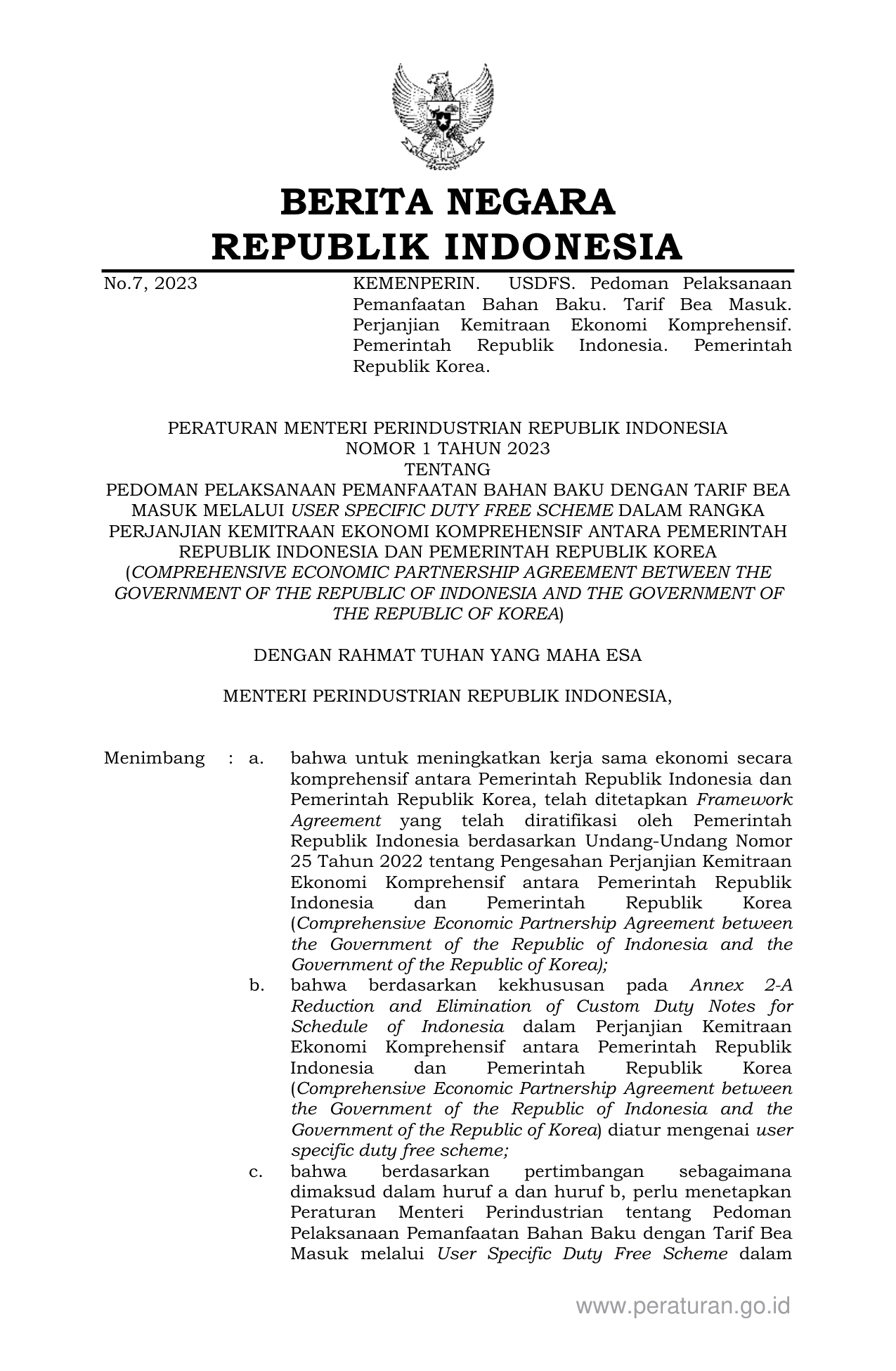 PERMEN Nomor 1 Tahun 2023 | Peraturan Menteri Nomor 1 Tahun 2023 tentang PEDOMAN PELAKSANAAN PEMANFAATAN BAHAN BAKU DENGAN TARIF BEAMASUK MELALUI USER SPECIFIC DUTY FREE SCHEME DALAM RANGKA PERJANJIAN KEMITRAAN EKONOMI KOMPREHENSIF ANTARA PEMERINTAHREPUBLIK INDONESIA DAN PEMERINTAH REPUBLIK KOREA (COMPREHENSIVE ECONOMIC PARTNERSHIP AGREEMENT BETWEEN THE GOVERNMENT OF THE REPUBLIC OF INDONESIA AND THE GOVERNMENT OF THE REPUBLIC OF KOREA)