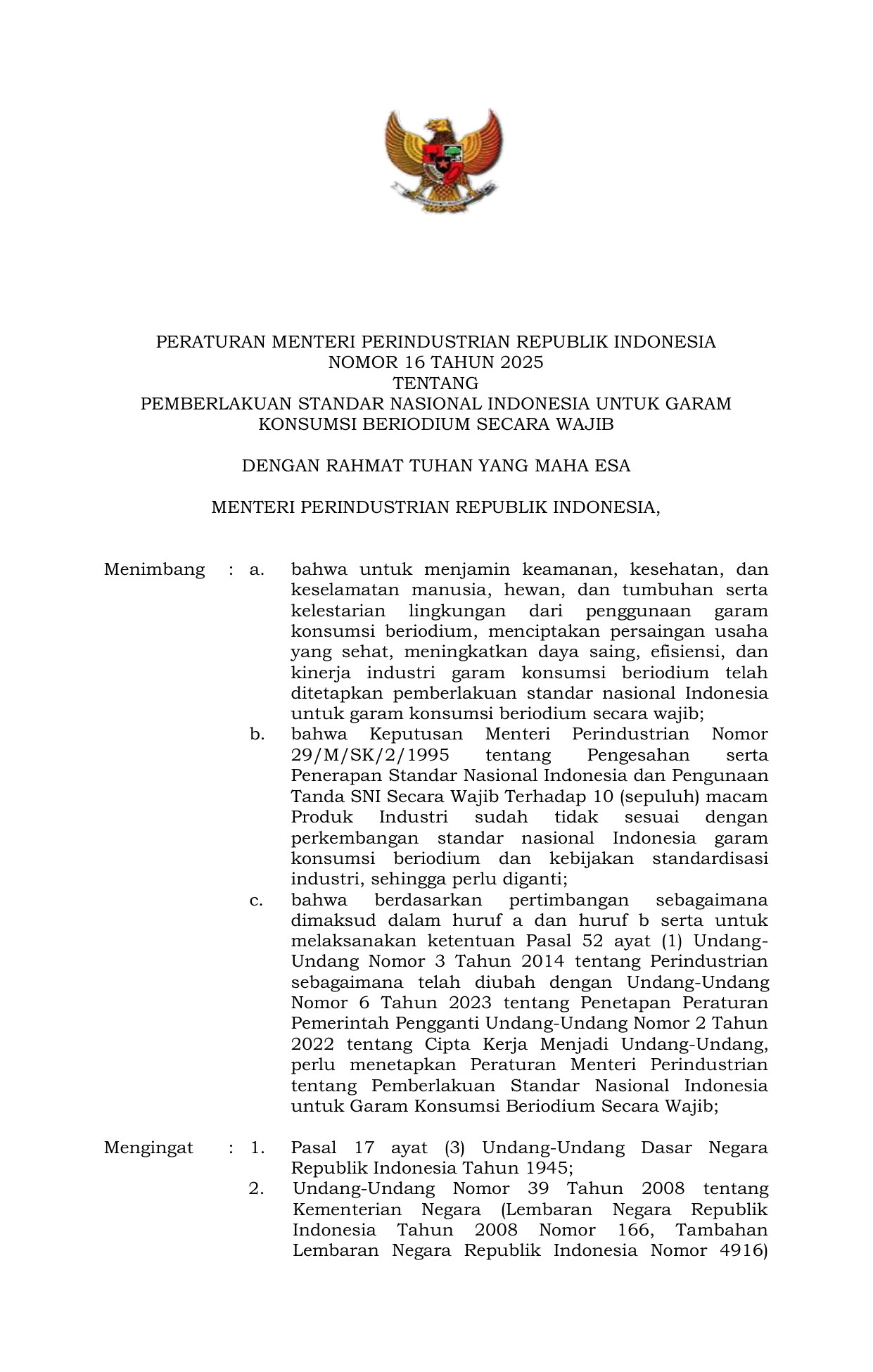 PERMEN Nomor 16 Tahun 2025 | Peraturan Menteri Nomor 16 Tahun 2025 tentang Pemberlakuan Standar Nasional Indonesia Untuk Garam Konsumsi Beriodium Secara Wajib