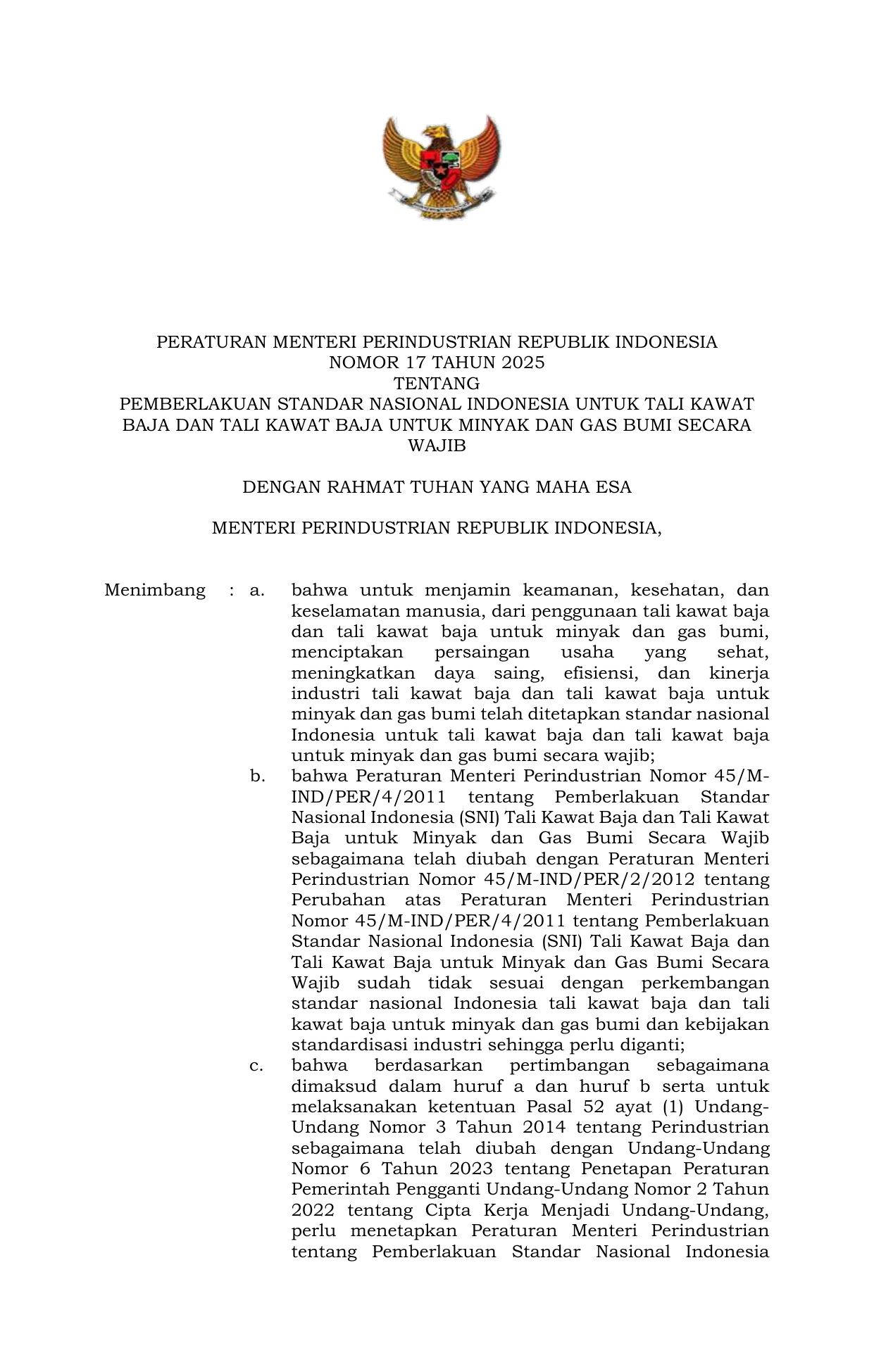 PERMEN Nomor 17 Tahun 2025 | Peraturan Menteri Nomor 17 Tahun 2025 tentang Pemberlakuan Standar Nasional Indonesia Untuk Tali Kawat Baja Dan Tali Kawat Baja Untuk Minyak Dan Gas Bumi Secara Wajib