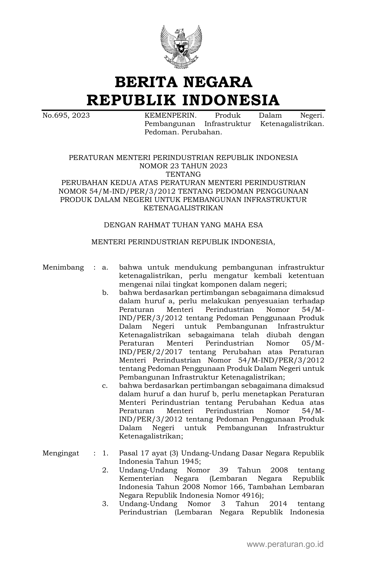 PERMEN Nomor 23 Tahun 2023 | Peraturan Menteri Nomor 23 Tahun 2023 tentang PERUBAHAN KEDUA ATAS PERATURAN MENTERI PERINDUSTRIAN NOMOR 54/M-IND/PER/3/2012 TENTANG PEDOMAN PENGGUNAAN PRODUK DALAM NEGERI UNTUK PEMBANGUNAN INFRASTRUKTUR KETENAGALISTRIKAN