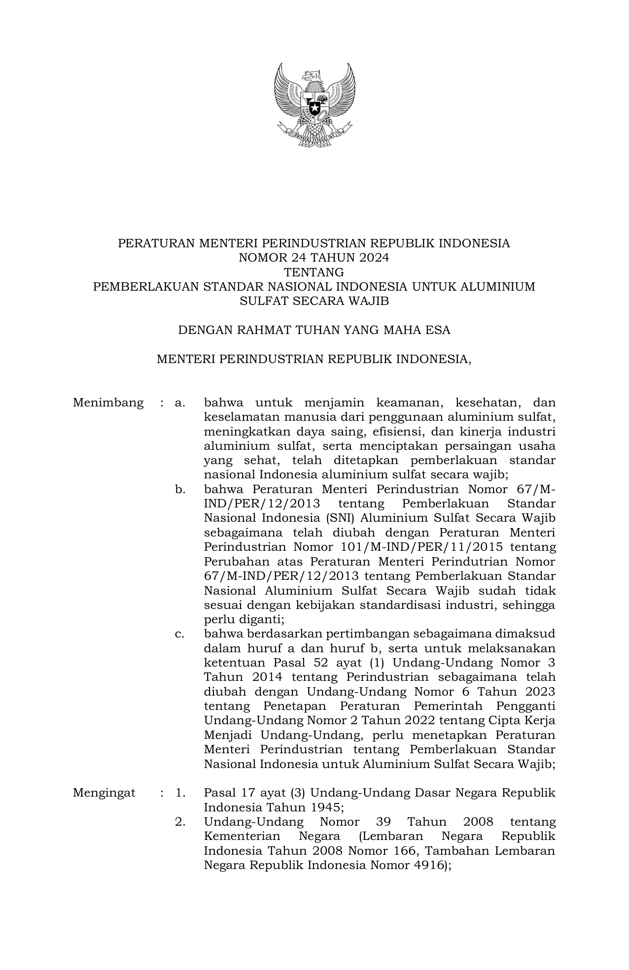 PERMEN Nomor 24 Tahun 2024 | Peraturan Menteri Nomor 24 Tahun 2024 tentang Pemberlakuan Standar Nasional Indonesia Untuk Almunium Sulfat Secara Wajib