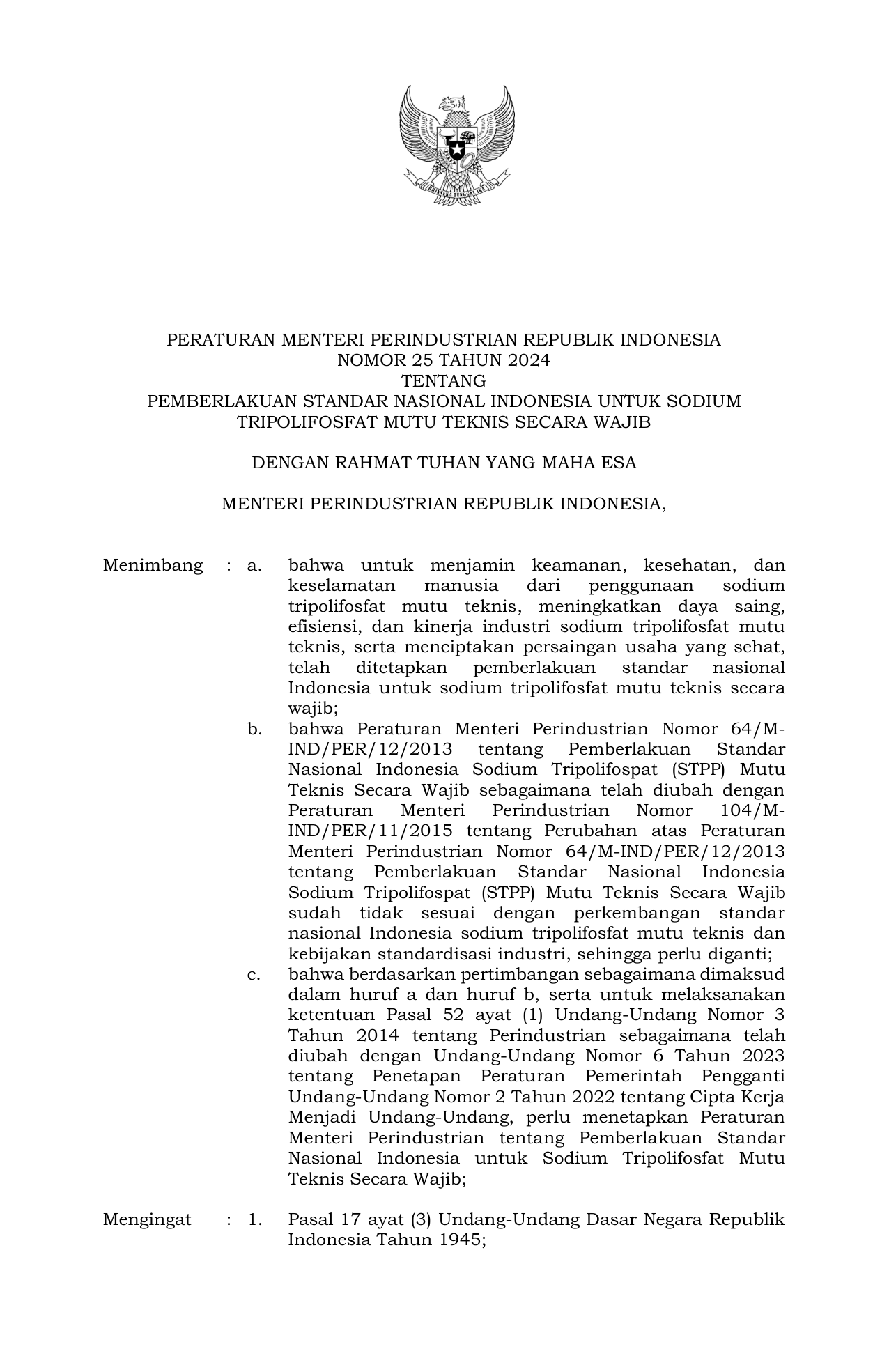 PERMEN Nomor 25 Tahun 2024 | Peraturan Menteri Nomor 25 Tahun 2024 tentang Pemberlakuan Standar Nasional Indonesia Untuk Sodium Tripolifosfat Mutu Teknis Secara Wajib