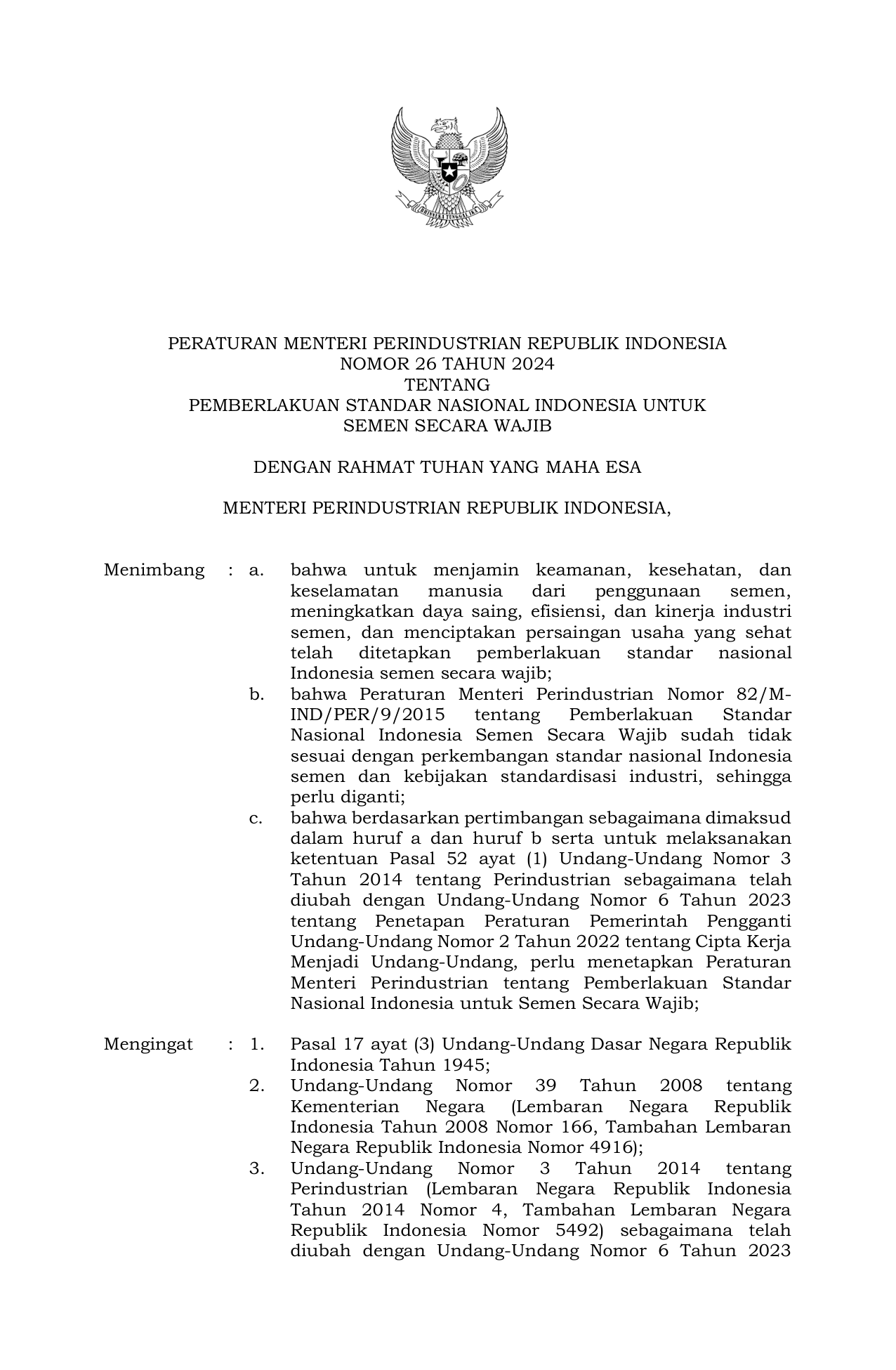 PERMEN Nomor 26 Tahun 2024 | Peraturan Menteri Nomor 26 Tahun 2024 tentang Pemberlakuan Standar Nasional Indonesia Untuk Semen Secara Wajib