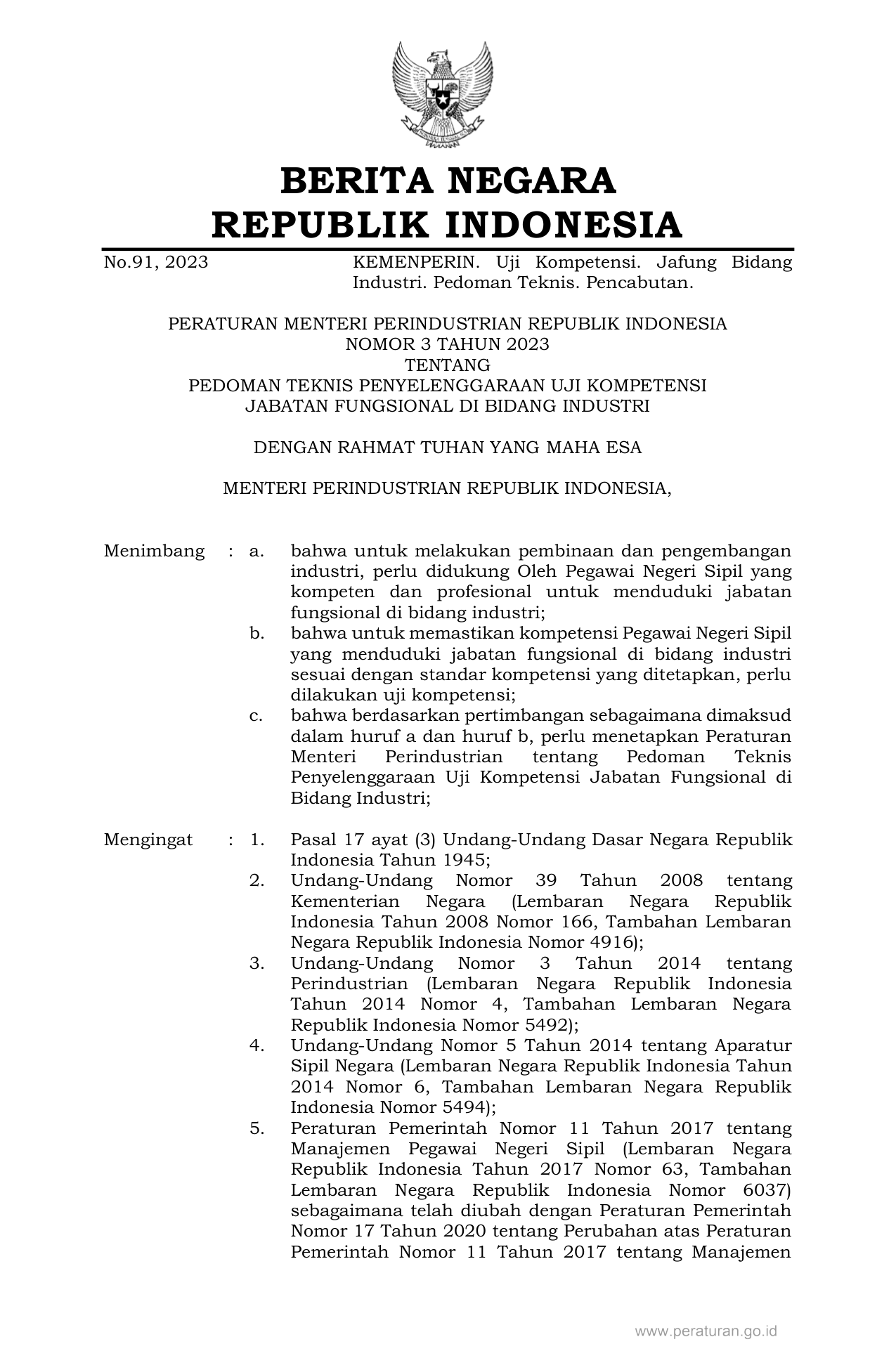 PERMEN Nomor 3 Tahun 2023 | Peraturan Menteri Nomor 3 Tahun 2023 tentang PEDOMAN TEKNIS PENYELENGGARAAN UJI KOMPETENSI JABATAN FUNGSIONAL DI BIDANG INDUSTRI