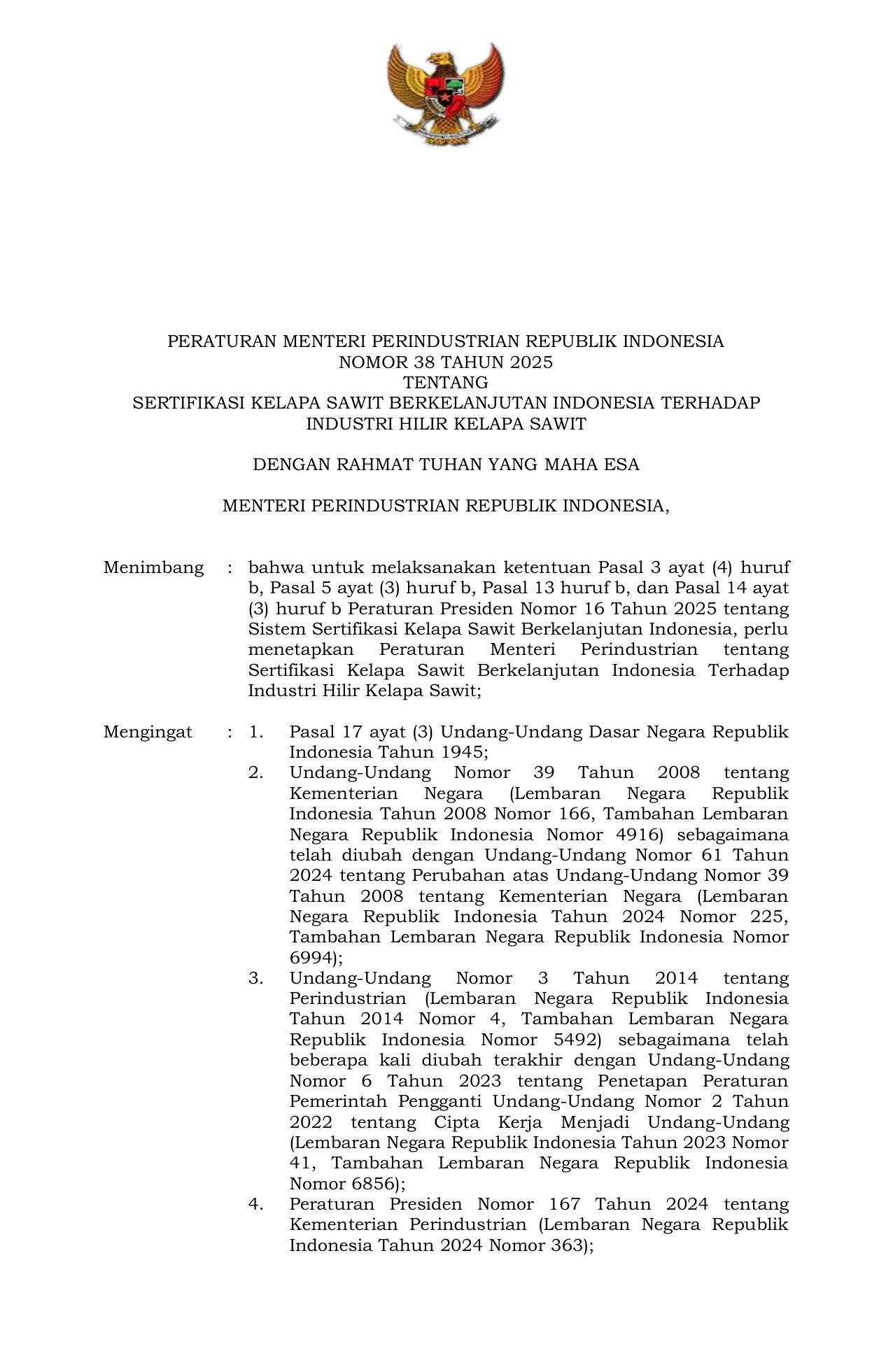 PERMEN Nomor 38 Tahun 2025 | Peraturan Menteri Nomor 38 Tahun 2025 tentang Sertifikasi Kelapa Sawit Berkelanjutan Indonesia Terhadap Industri Hilir Kelapa Sawit