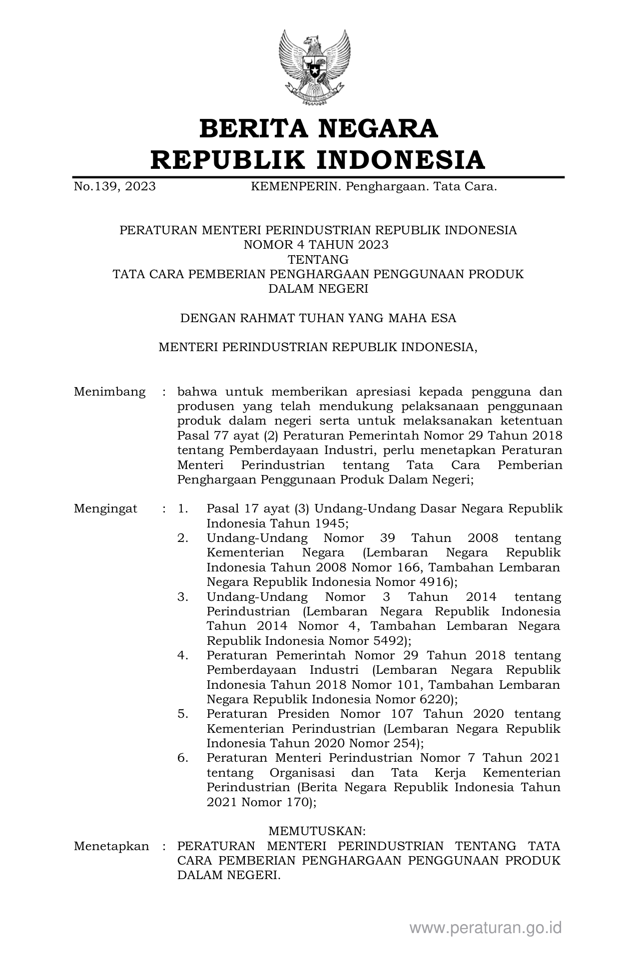 PERMEN Nomor 4 Tahun 2023 | Peraturan Menteri Nomor 4 Tahun 2023 tentang TATA CARA PEMBERIAN PENGHARGAAN PENGGUNAAN PRODUK DALAM NEGERI