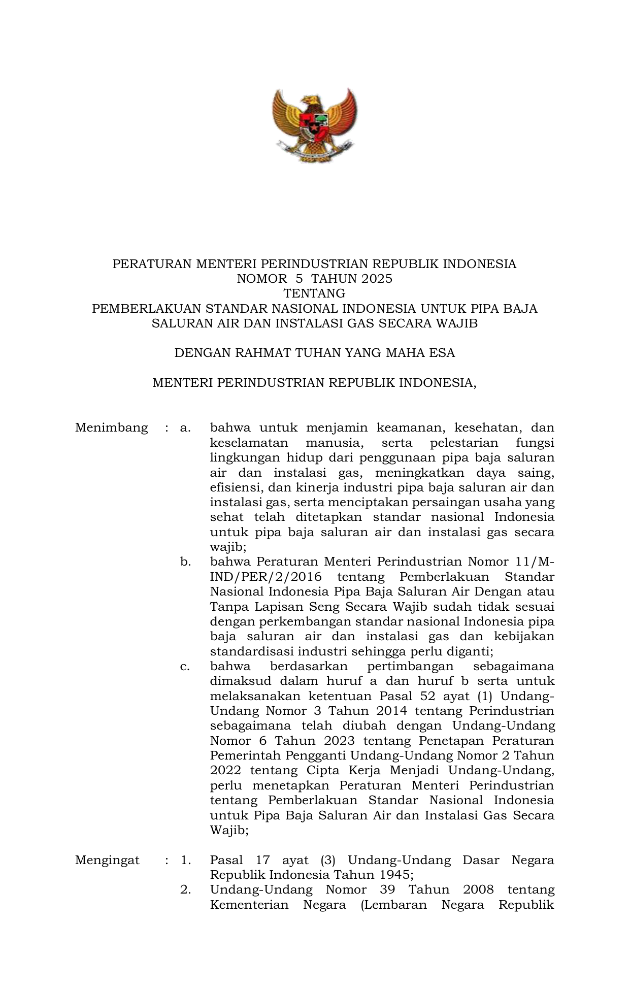 PERMEN Nomor 5 Tahun 2025 | Peraturan Menteri Nomor 5 Tahun 2025 tentang Pemberlakuan Standar Nasional Indonesia Untuk Pipa Baja Saluran Air Dan Instalasi Gas Secara Wajib