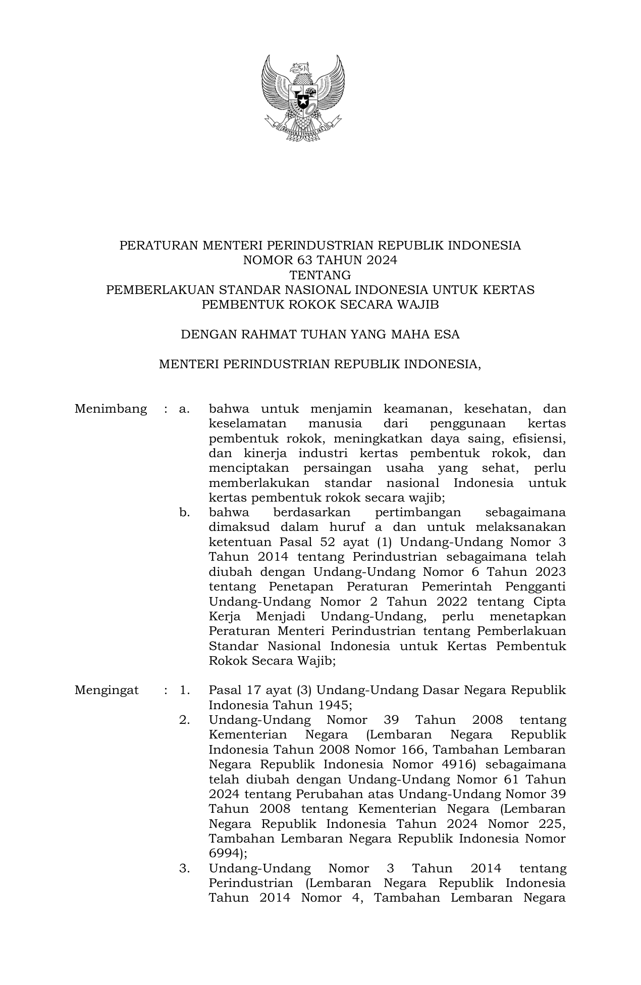 PERMEN Nomor 63 Tahun 2024 | Peraturan Menteri Nomor 63 Tahun 2024 tentang Pemberlakuan Standar Nasional Indonesia Untuk Kertas Pembentuk Rokok Secara Wajib