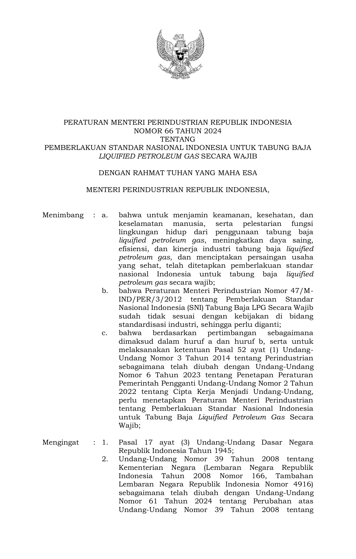 PERMEN Nomor 66 Tahun 2024 | Peraturan Menteri Nomor 66 Tahun 2024 tentang Pemberlakuan Standar Nasional Indonesia Untuk Tabung Baja Liquified Petroleum Gas Secara Wajib