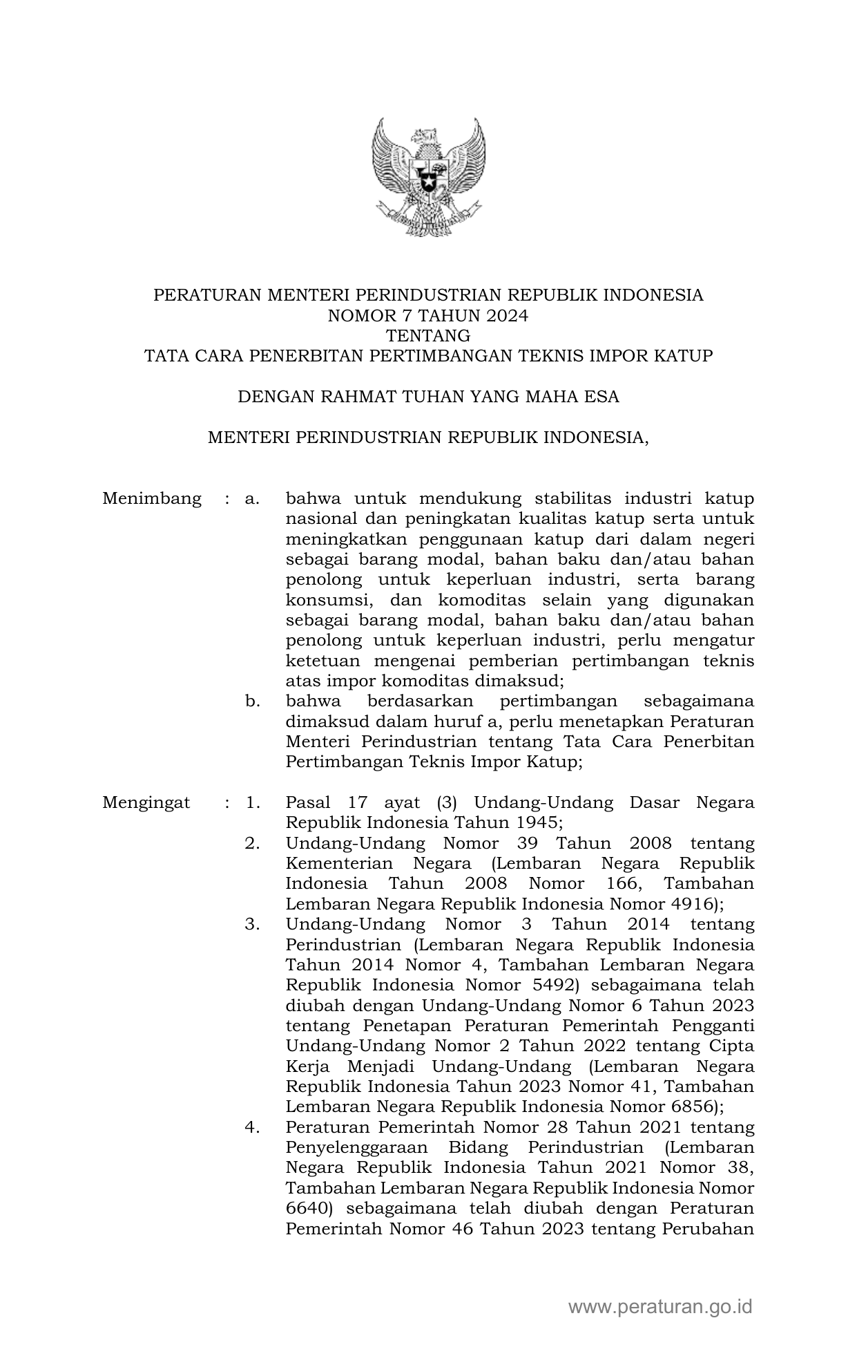 PERMEN Nomor 7 Tahun 2024 | Peraturan Menteri Nomor 7 Tahun 2024 tentang TATA CARA PENERBITAN PERTIMBANGAN TEKNIS IMPOR KATUP