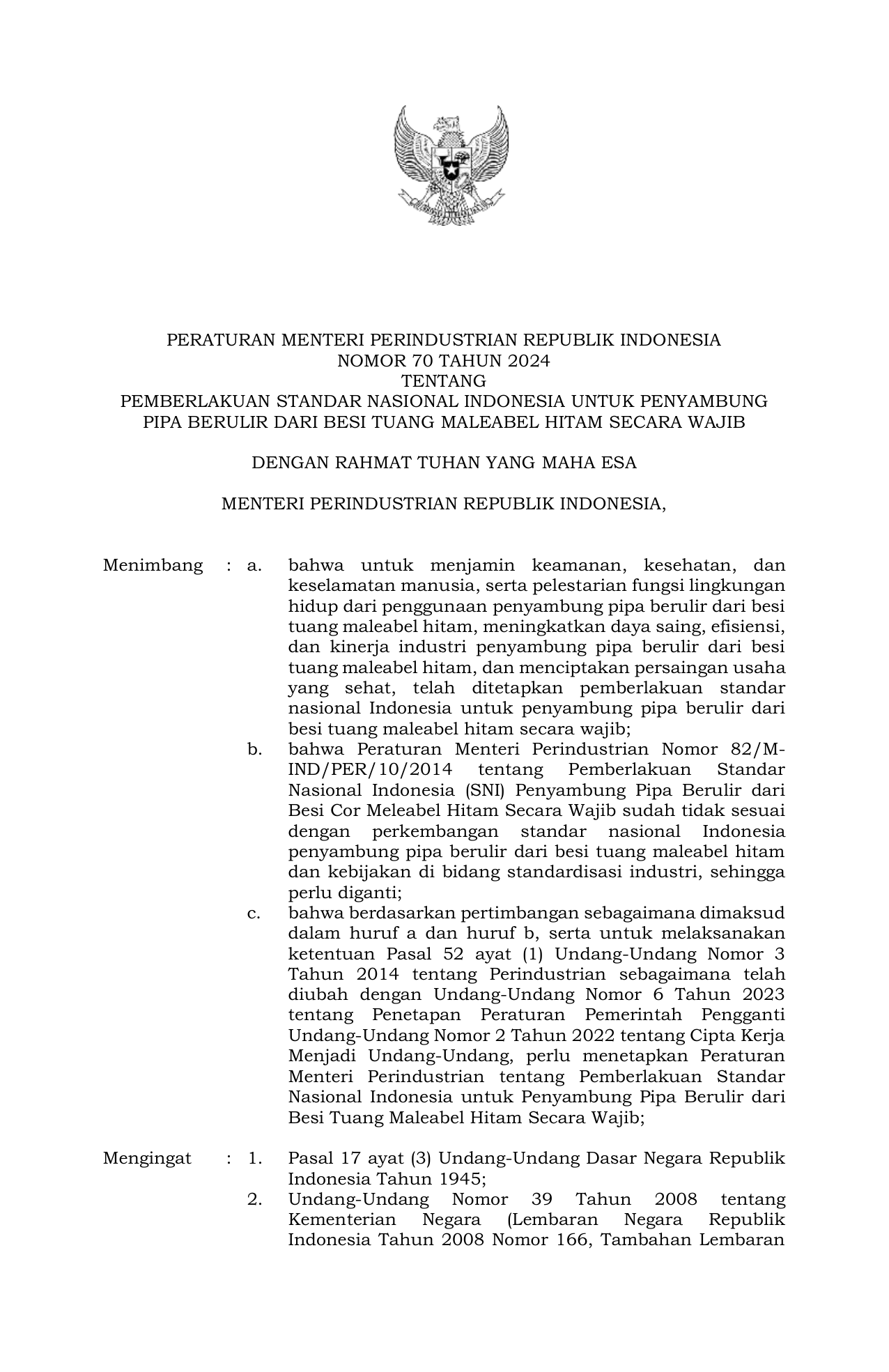 PERMEN Nomor 70 Tahun 2024 | Peraturan Menteri Nomor 70 Tahun 2024 tentang Pemberlakuan Standar Nasional Indonesia Untuk Penyambung Pipa Berulir dari Besi Tuang Maleabel Hitam Secara Wajib