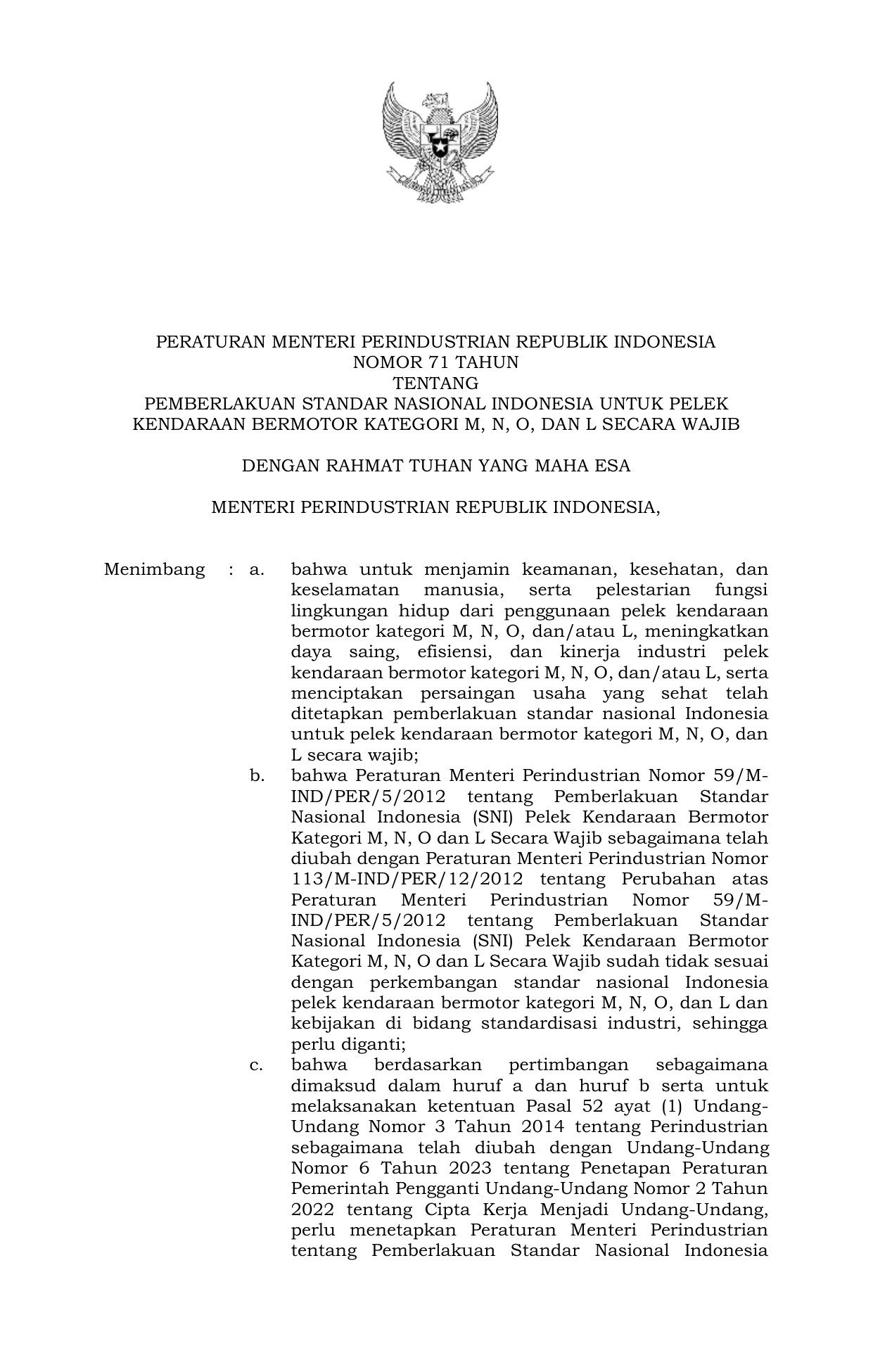 PERMEN Nomor 71 Tahun 2024 | Peraturan Menteri Nomor 71 Tahun 2024 tentang Pemberlakuan Standar Nasional Indonesia Untuk Pelek Kendaraan Bermotor Kategori M, N, O, dan L Secara Wajib